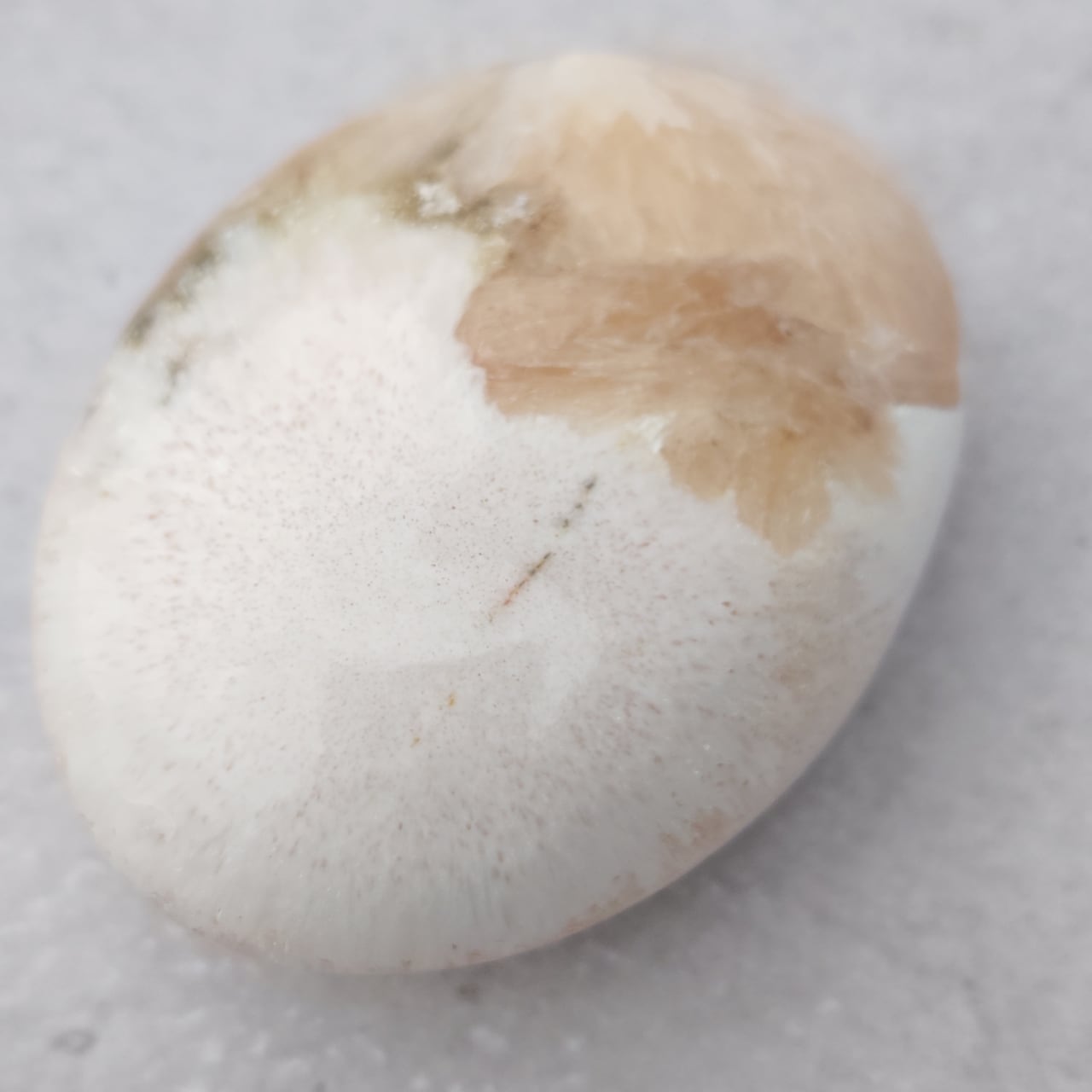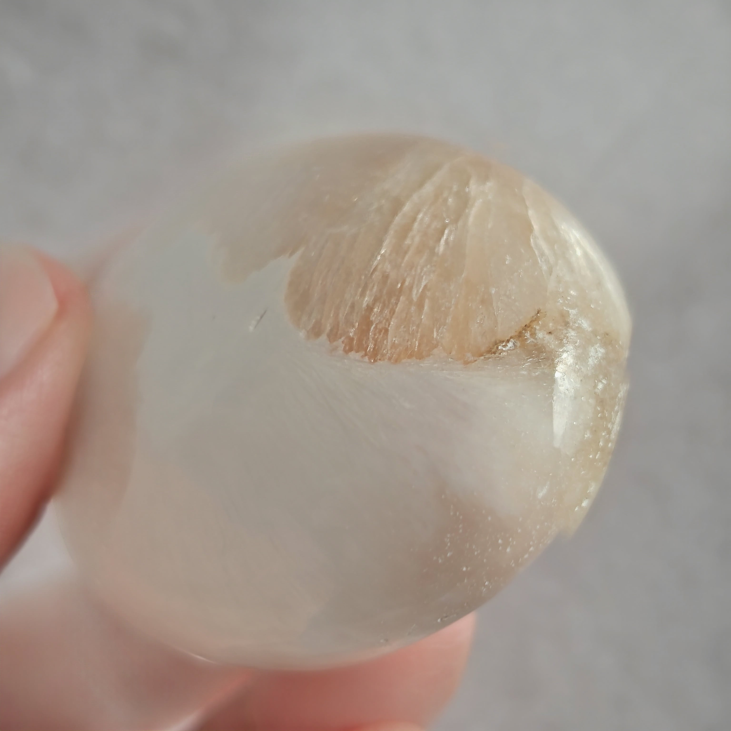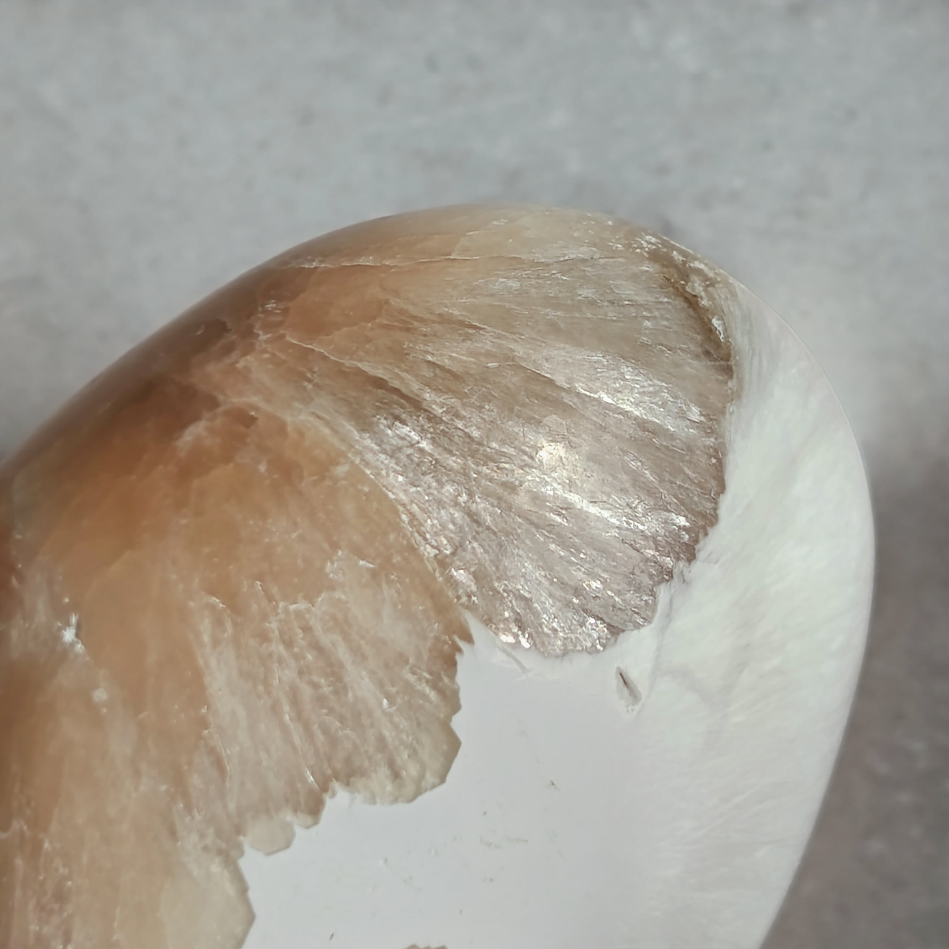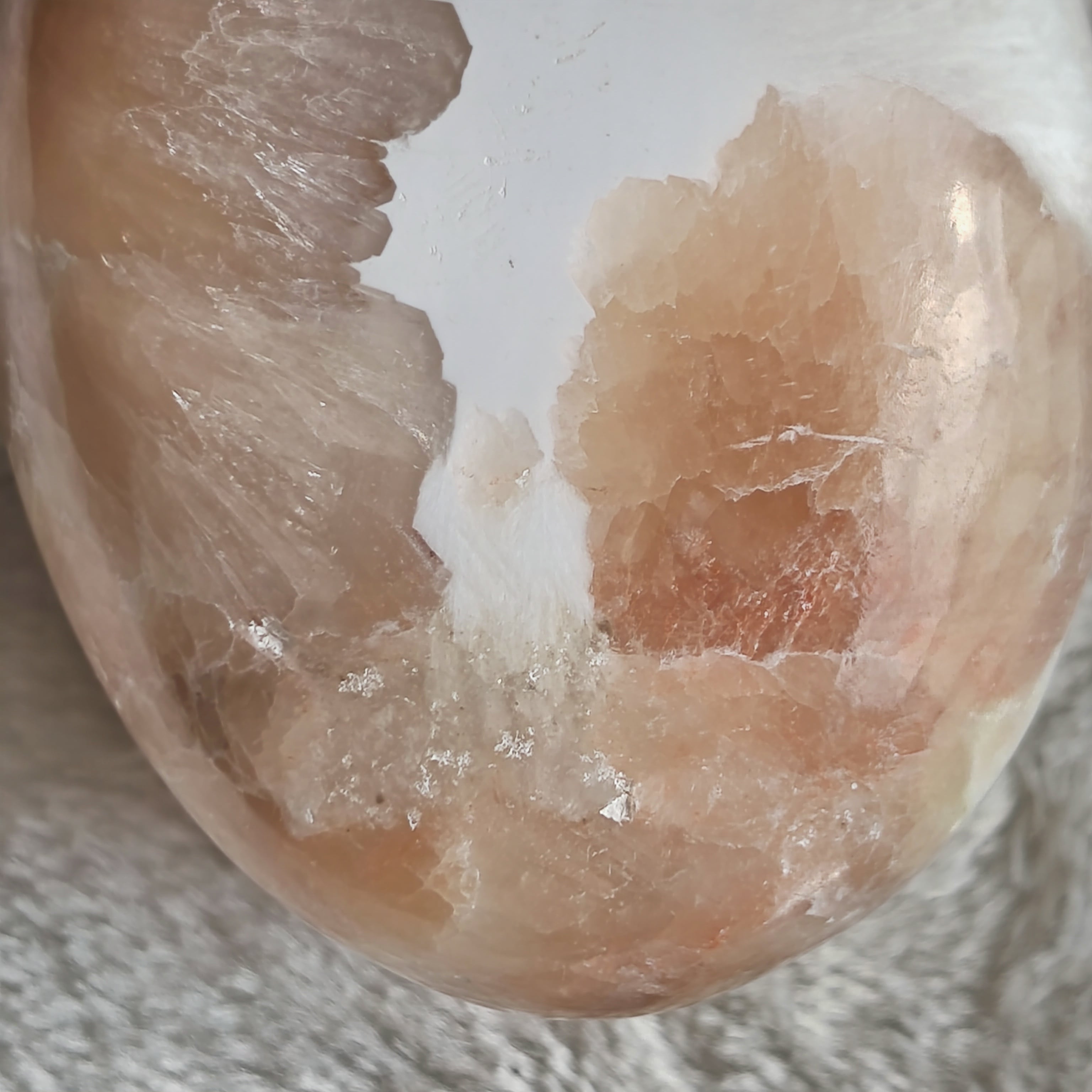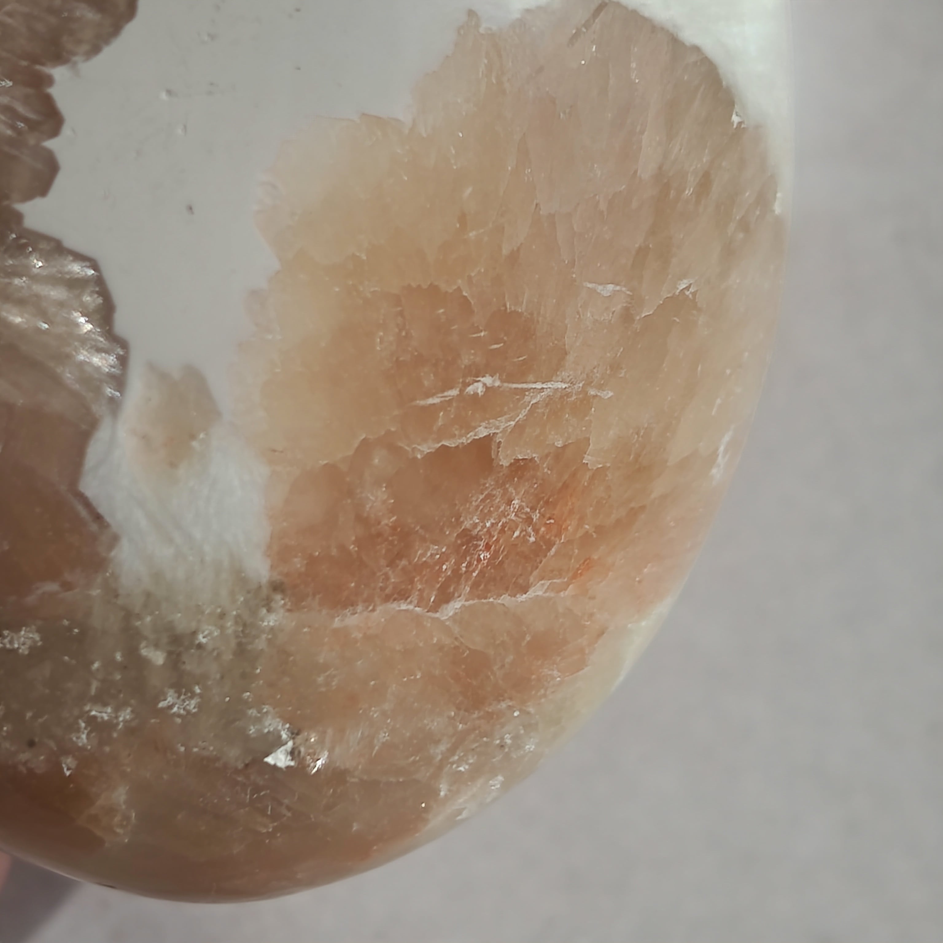 淡いピーチ色のピンクスティルバイトと、ミルキーホワイトに繊細な光を宿したスコレサイト。