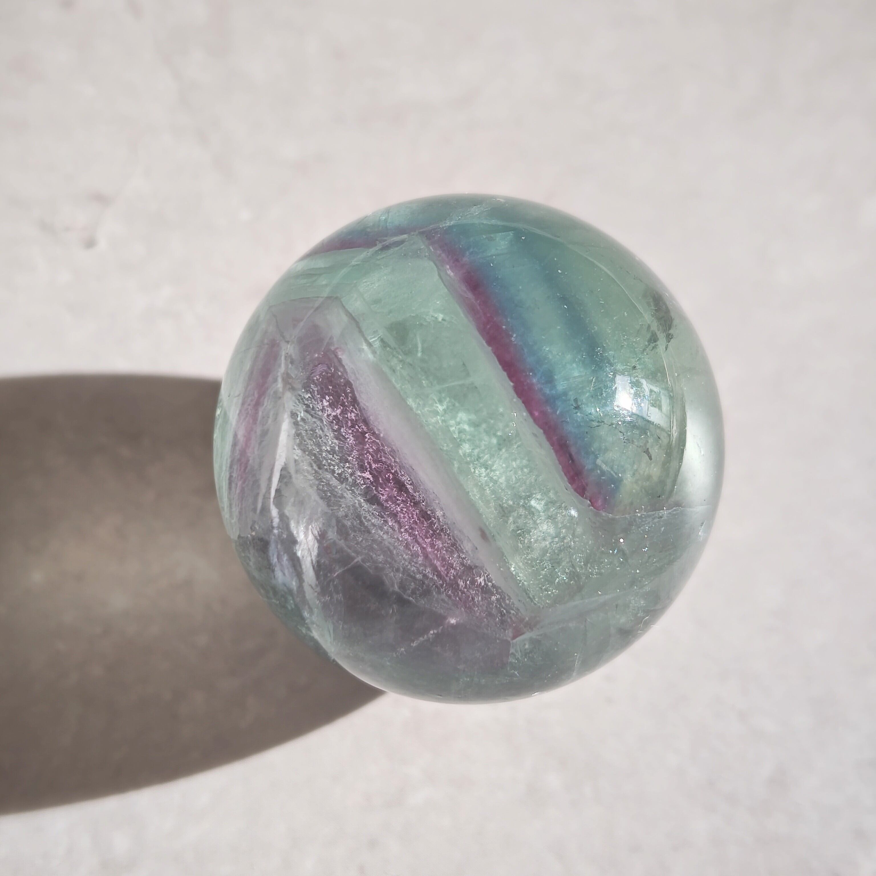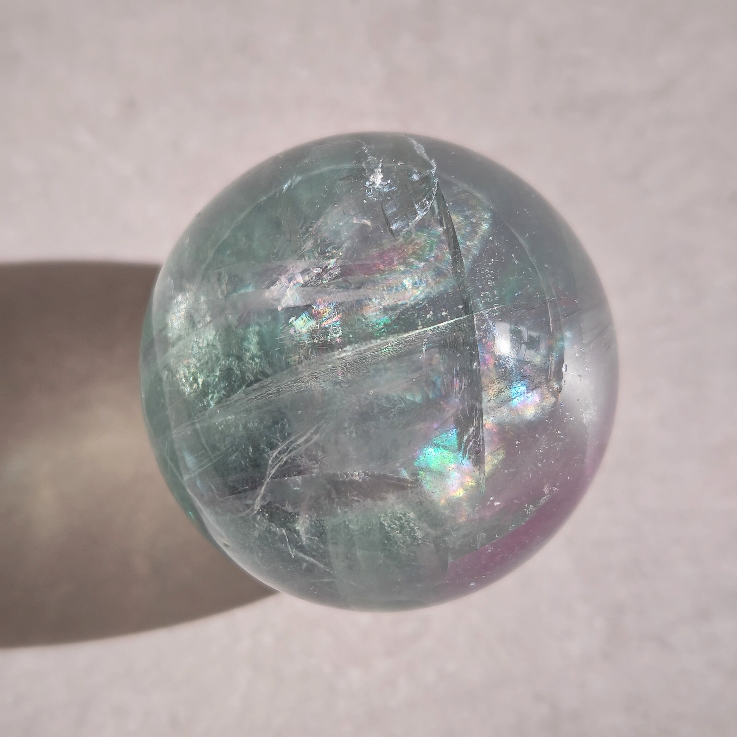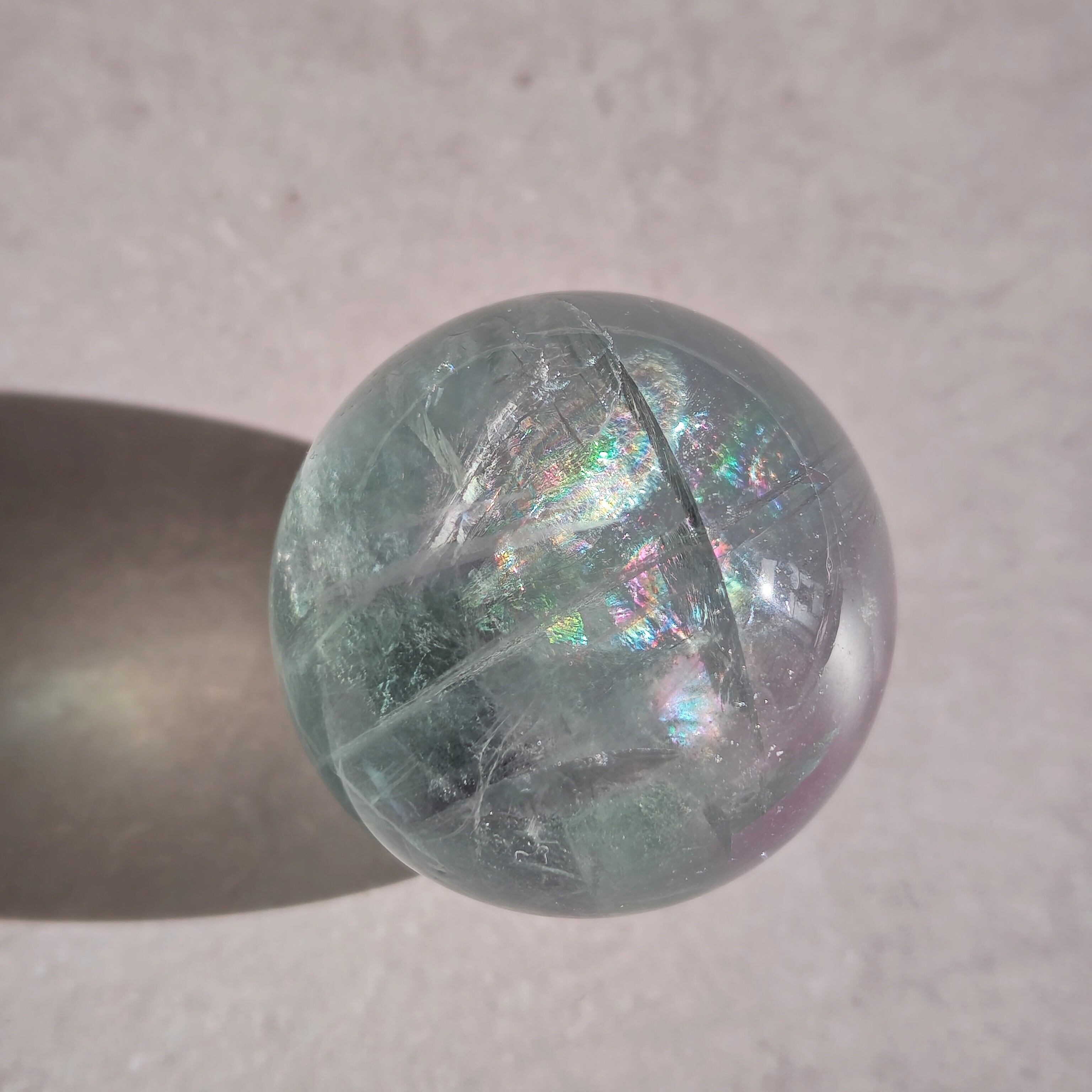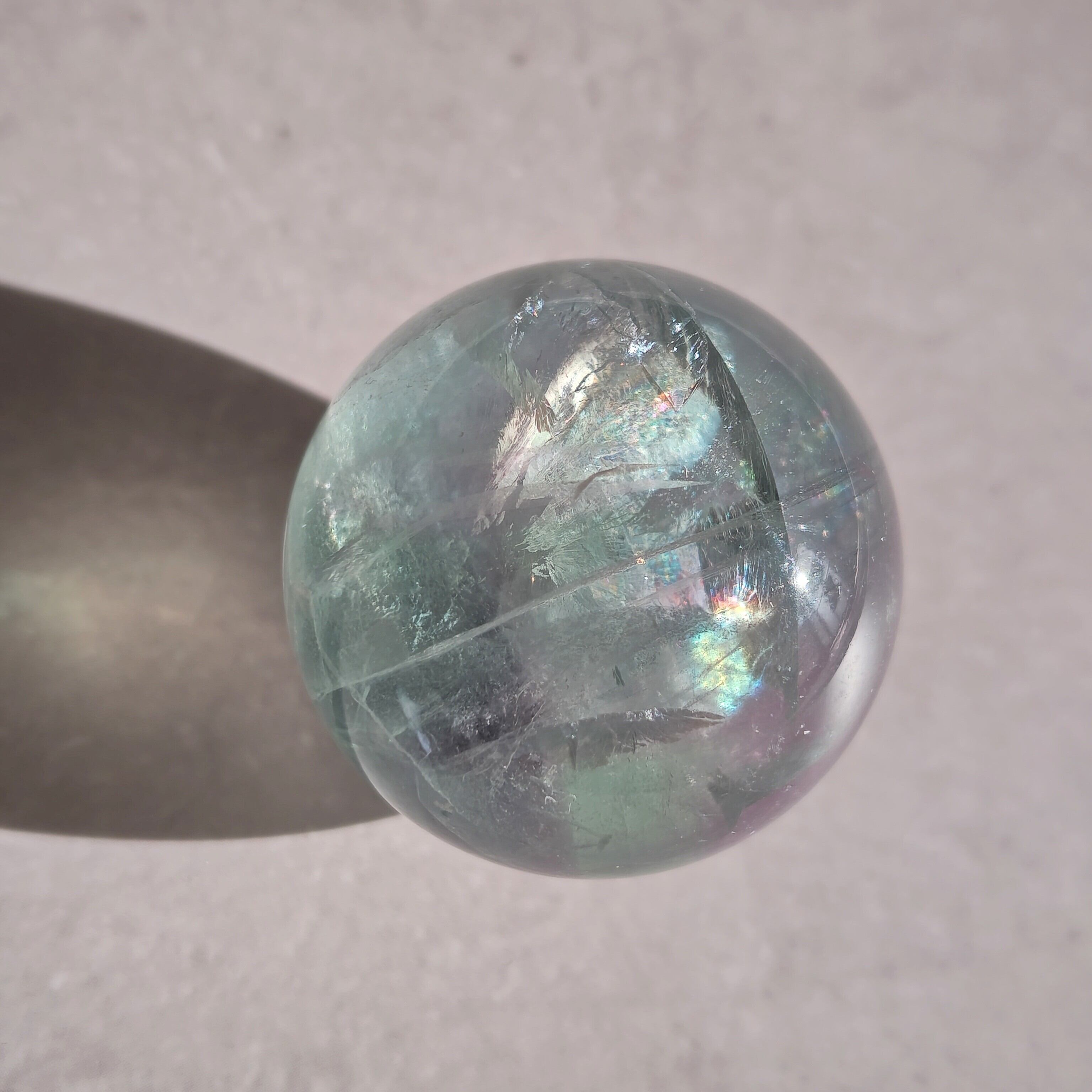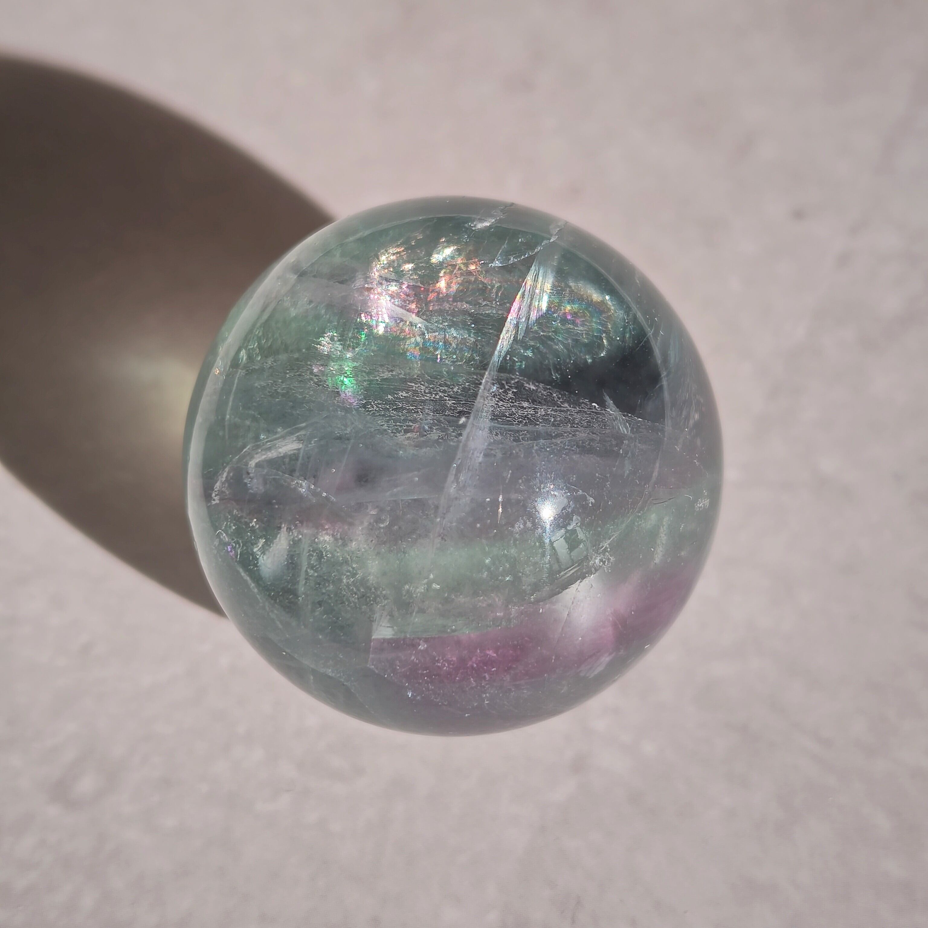 虹色のきらめきが現れるフローライトのスフィアです。