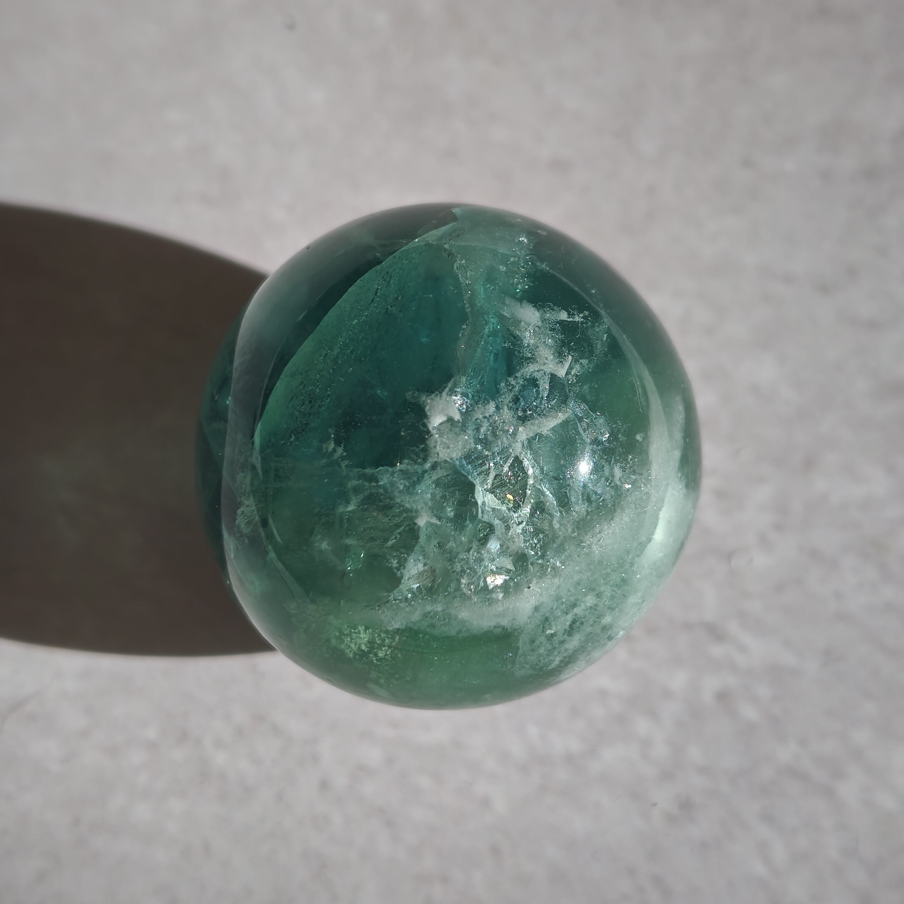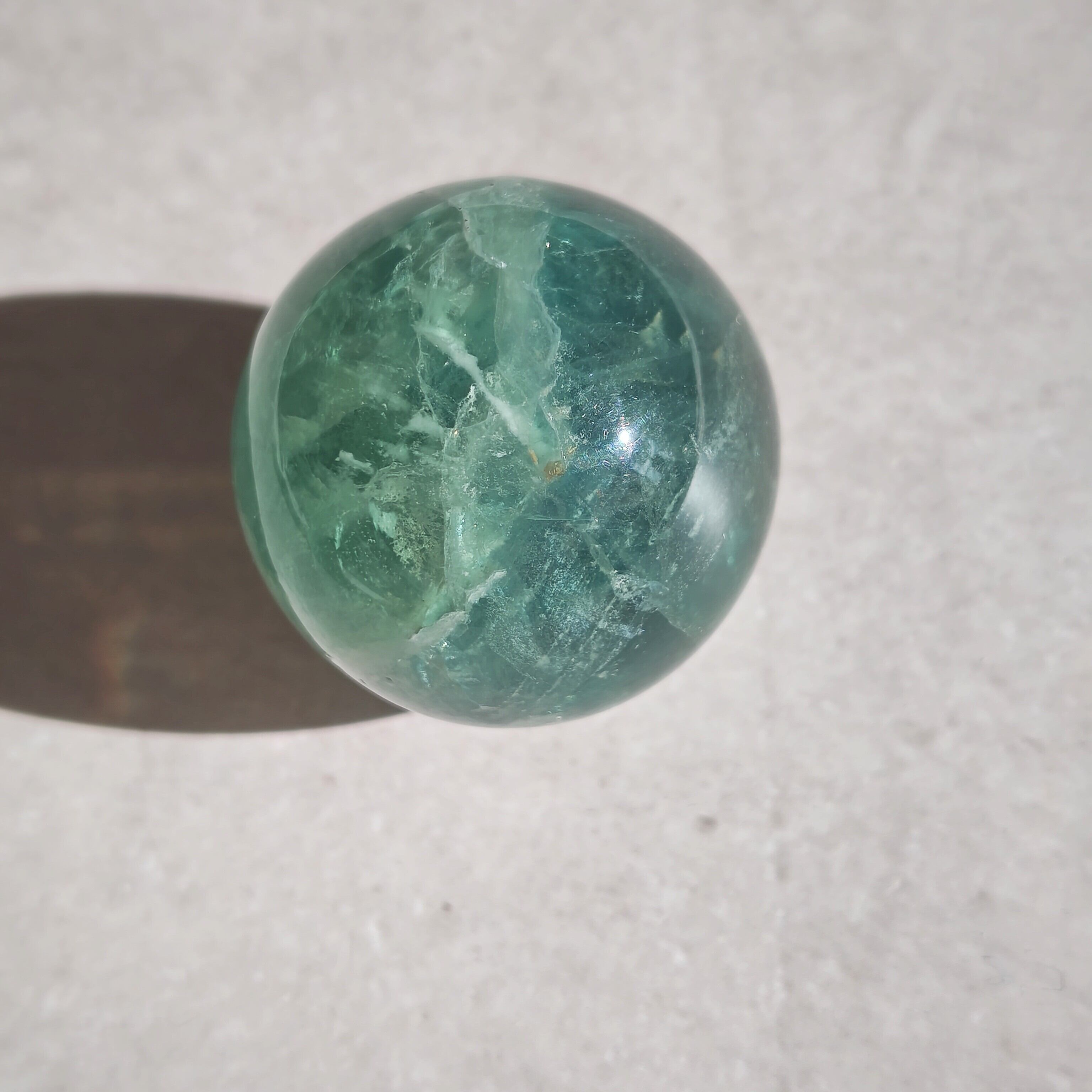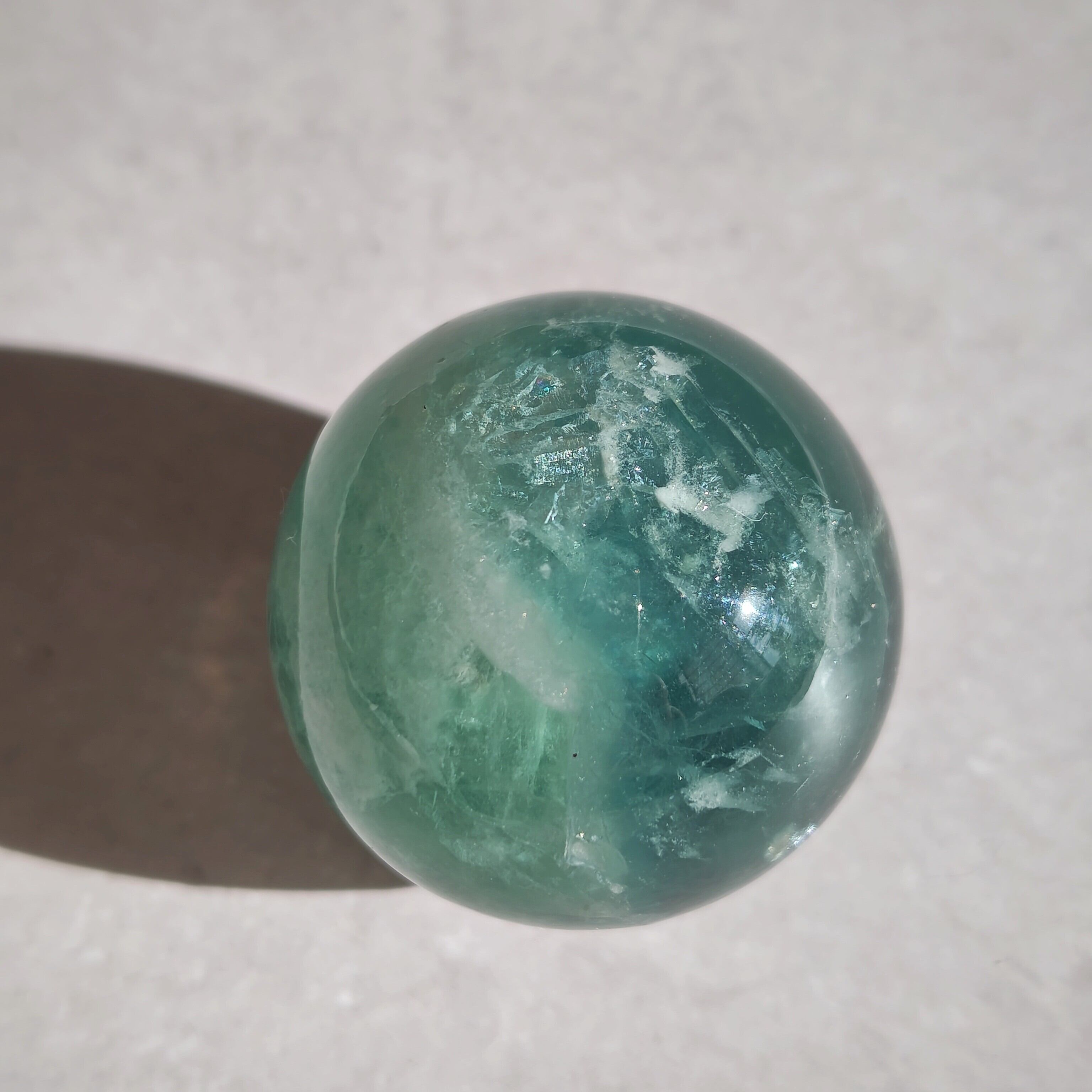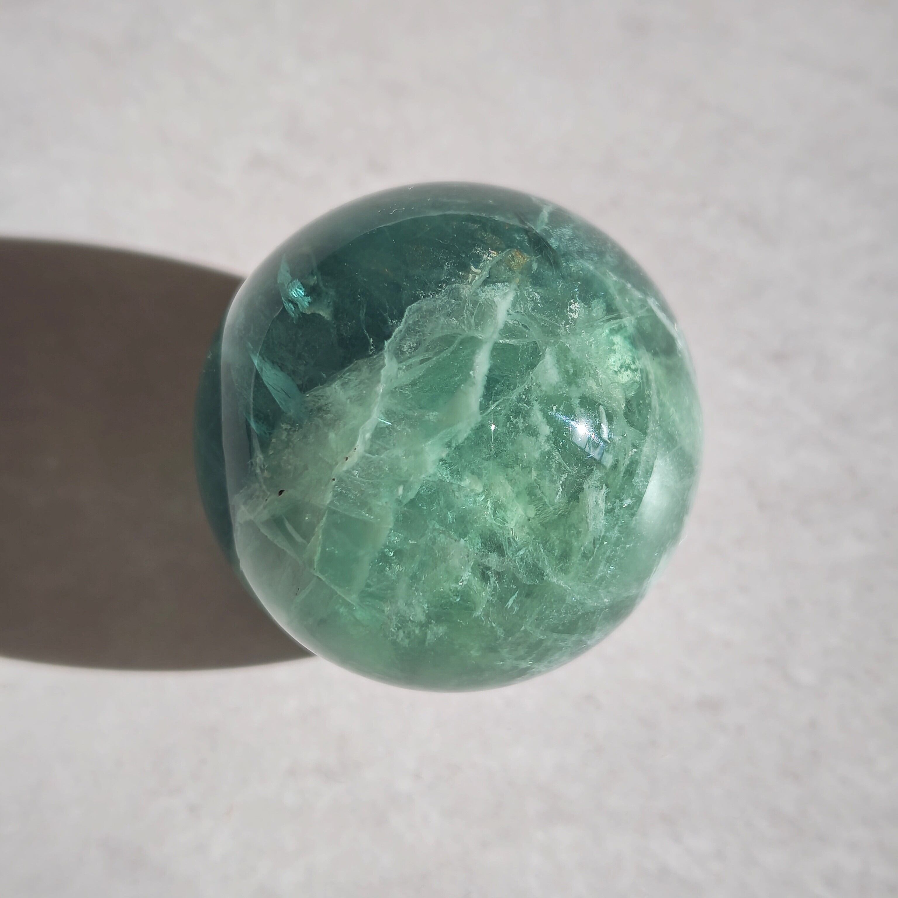 深緑と氷のような模様が綺麗なフローライトスフィア