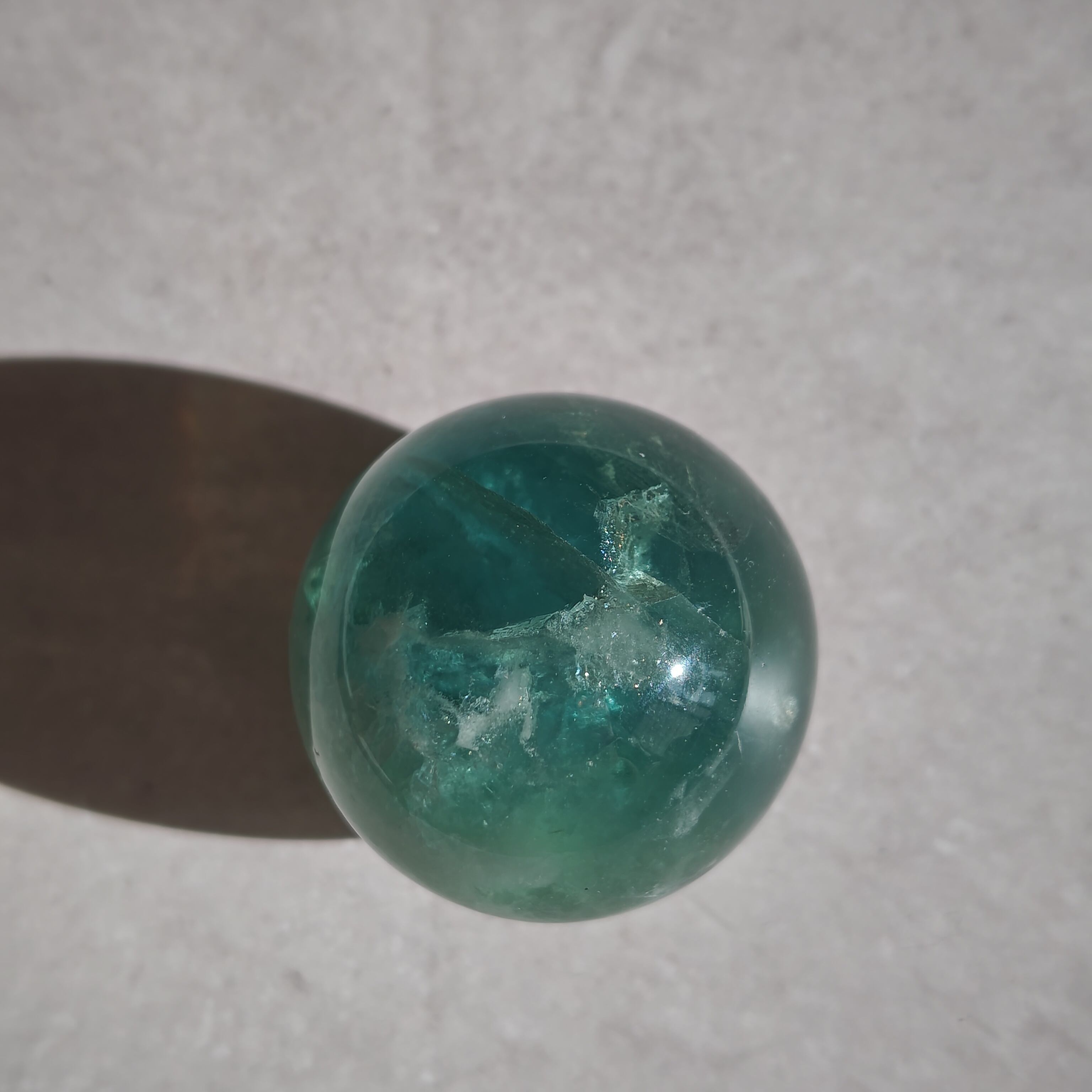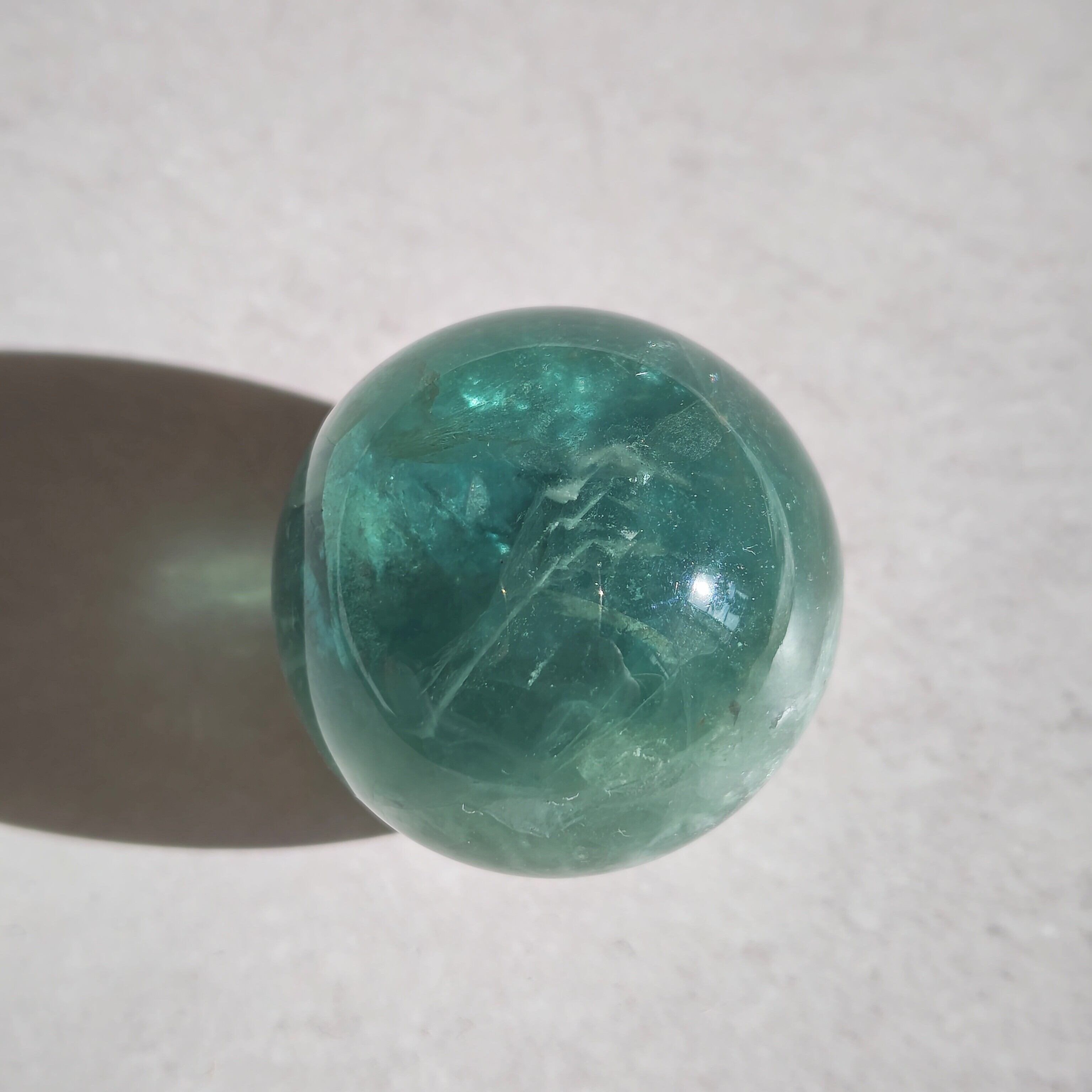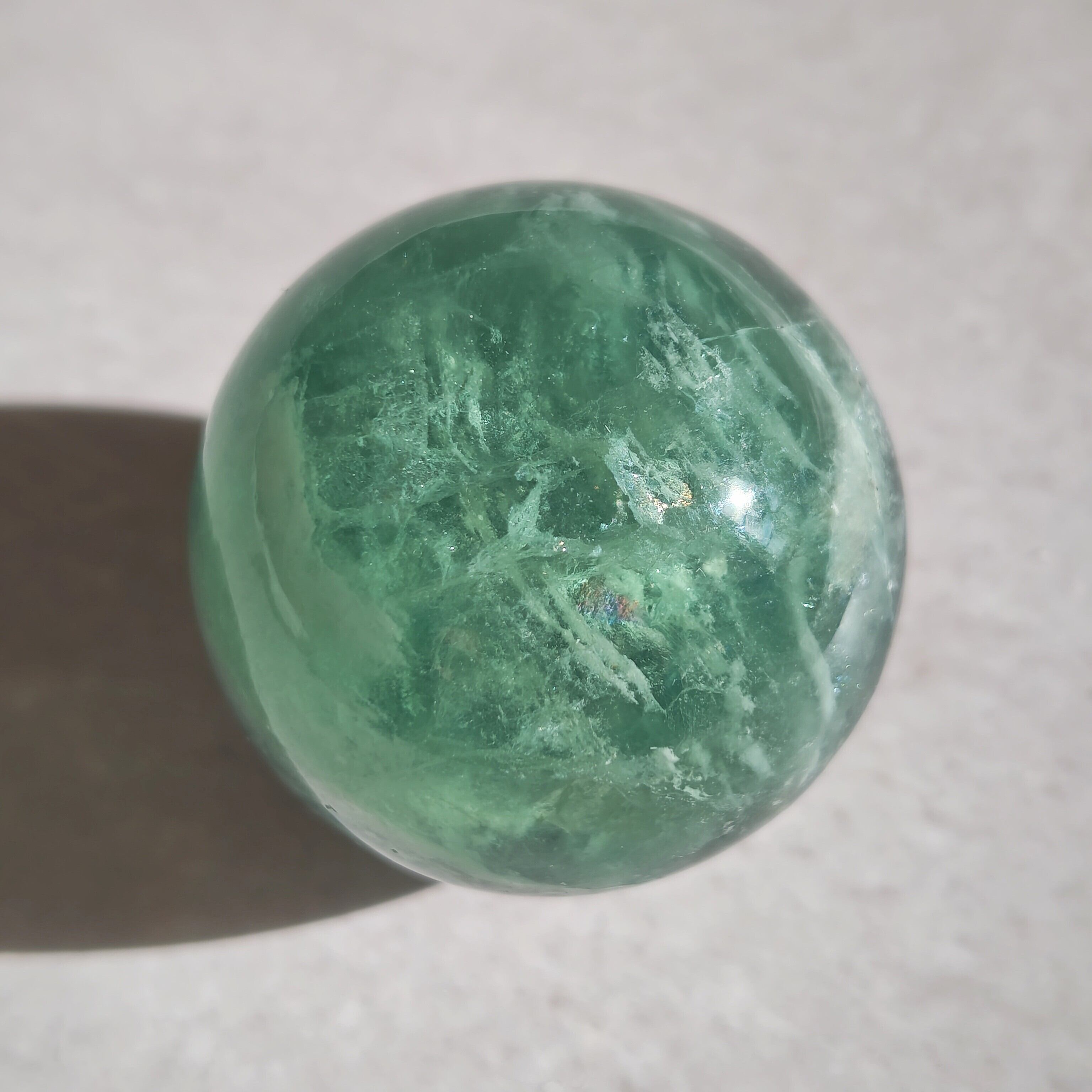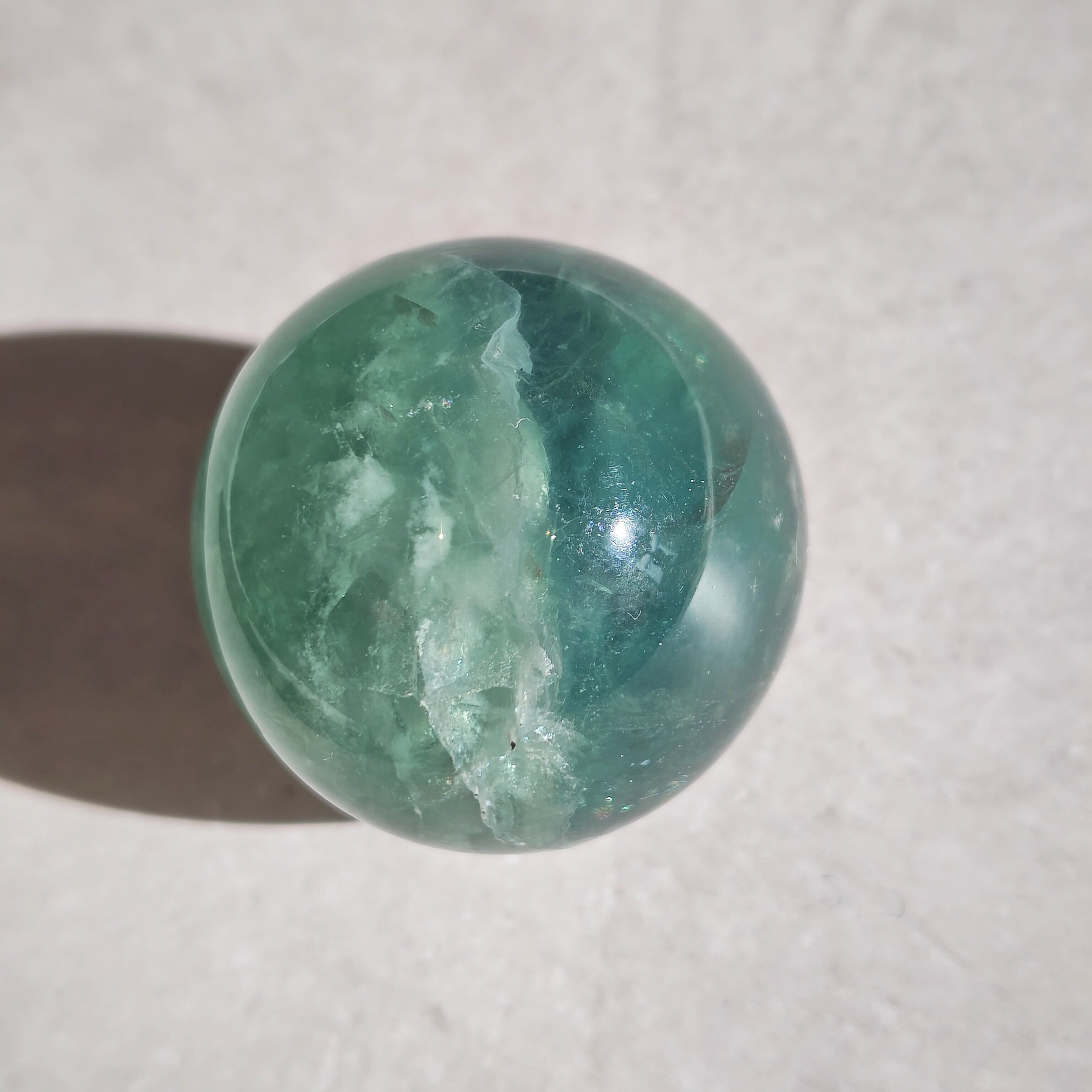 深緑と氷のような模様が綺麗なフローライトスフィア