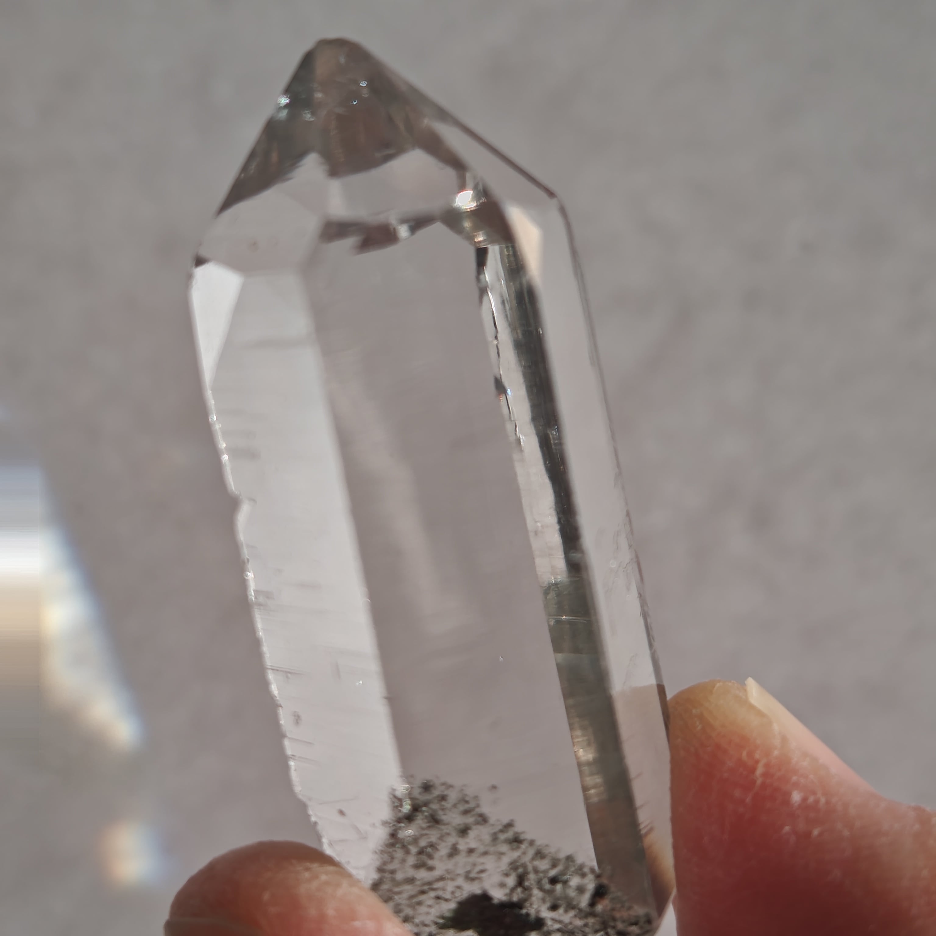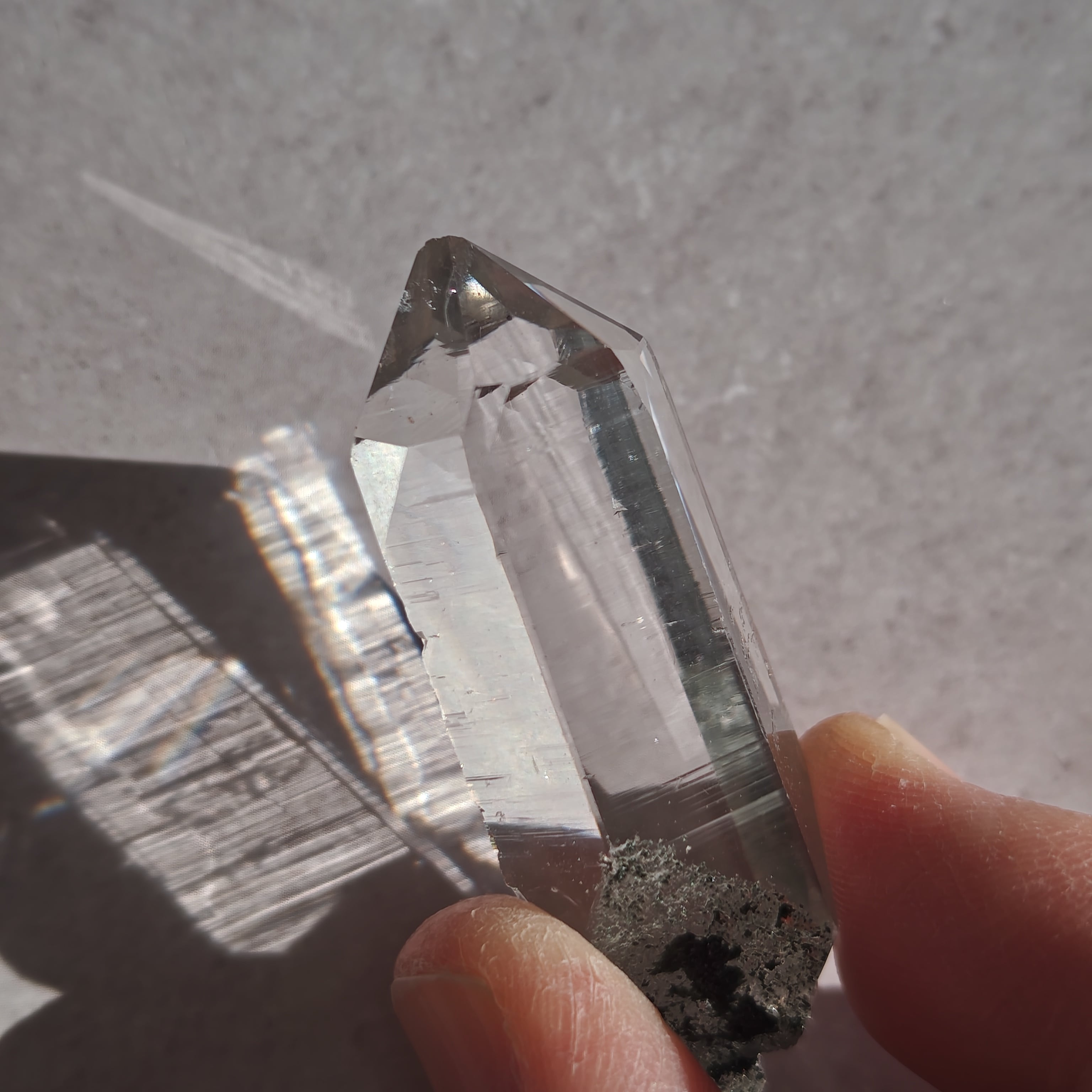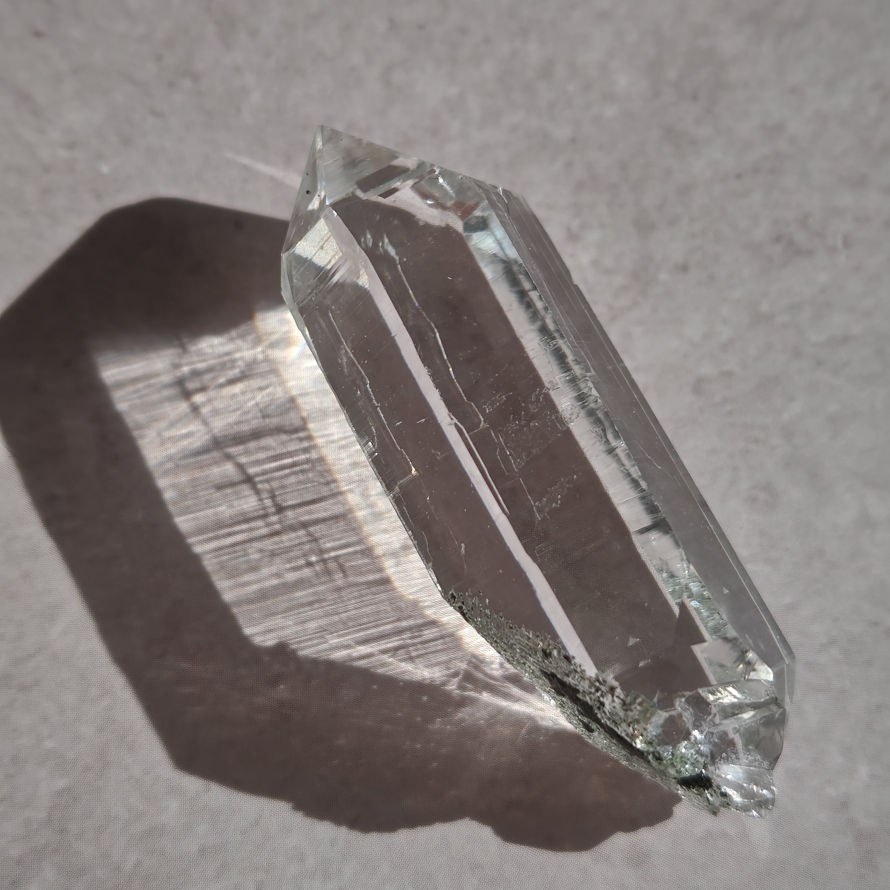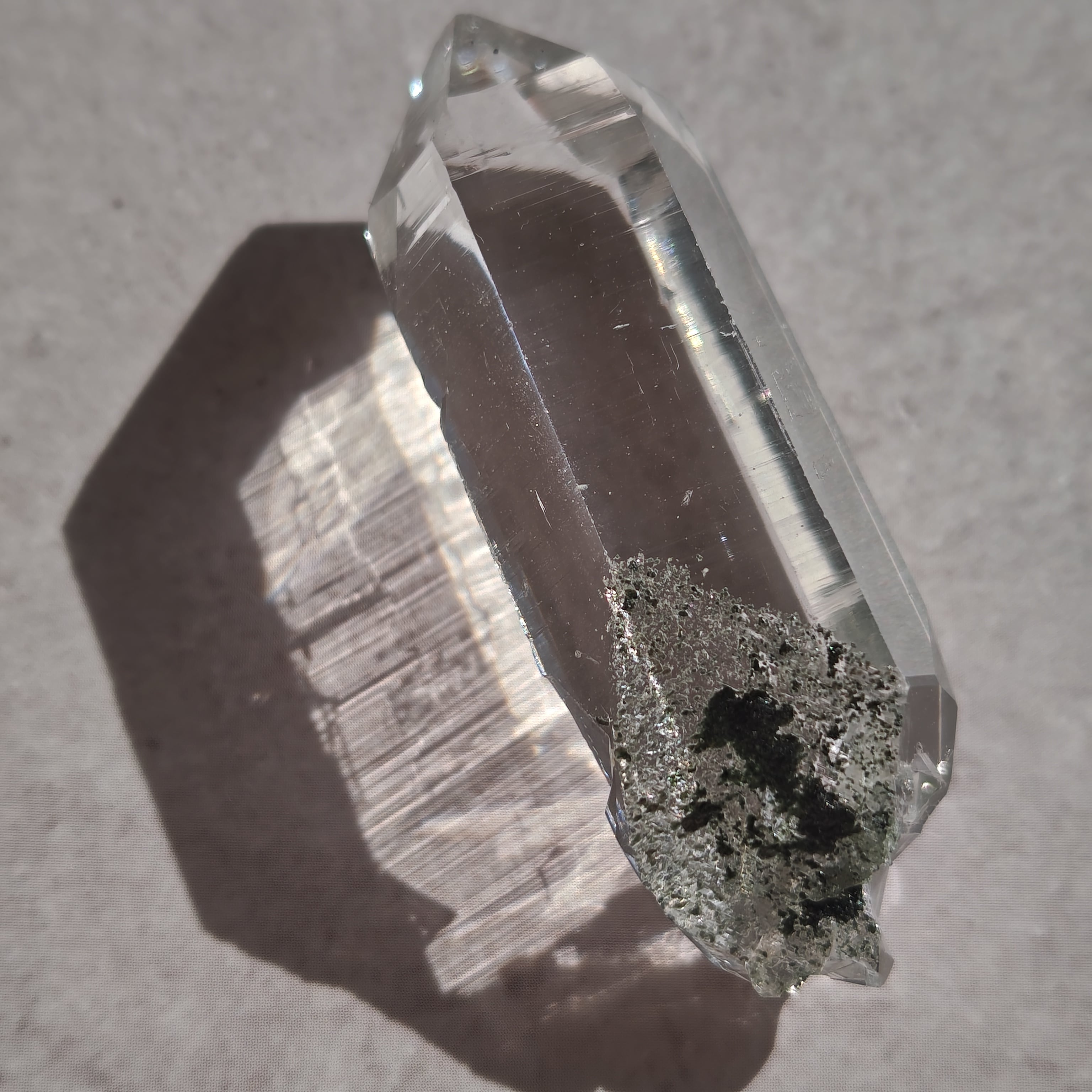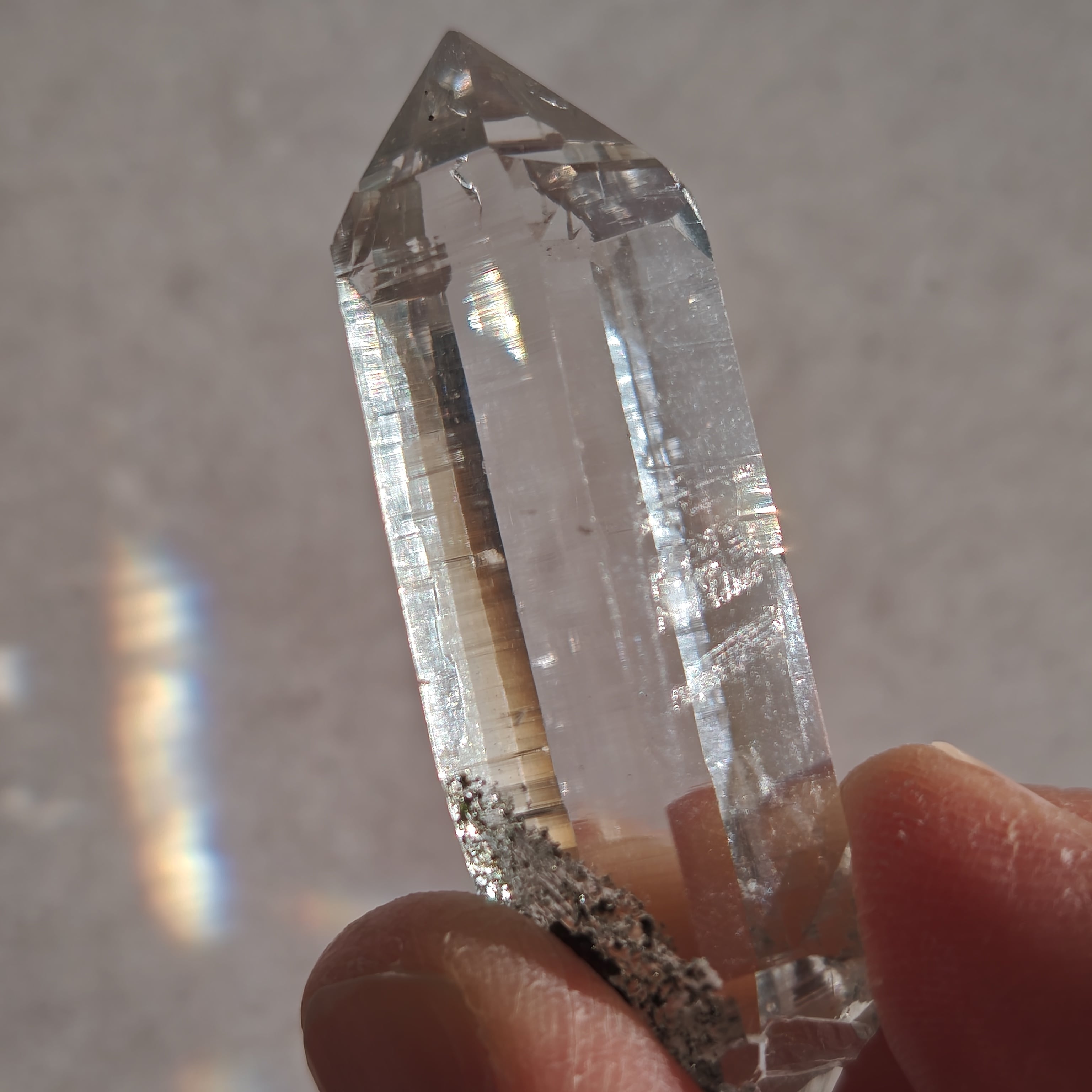 そっと背中を押す光を宿しています。この子は透明なだけではなく、根元に残る母岩の力強さにも惹かれました。