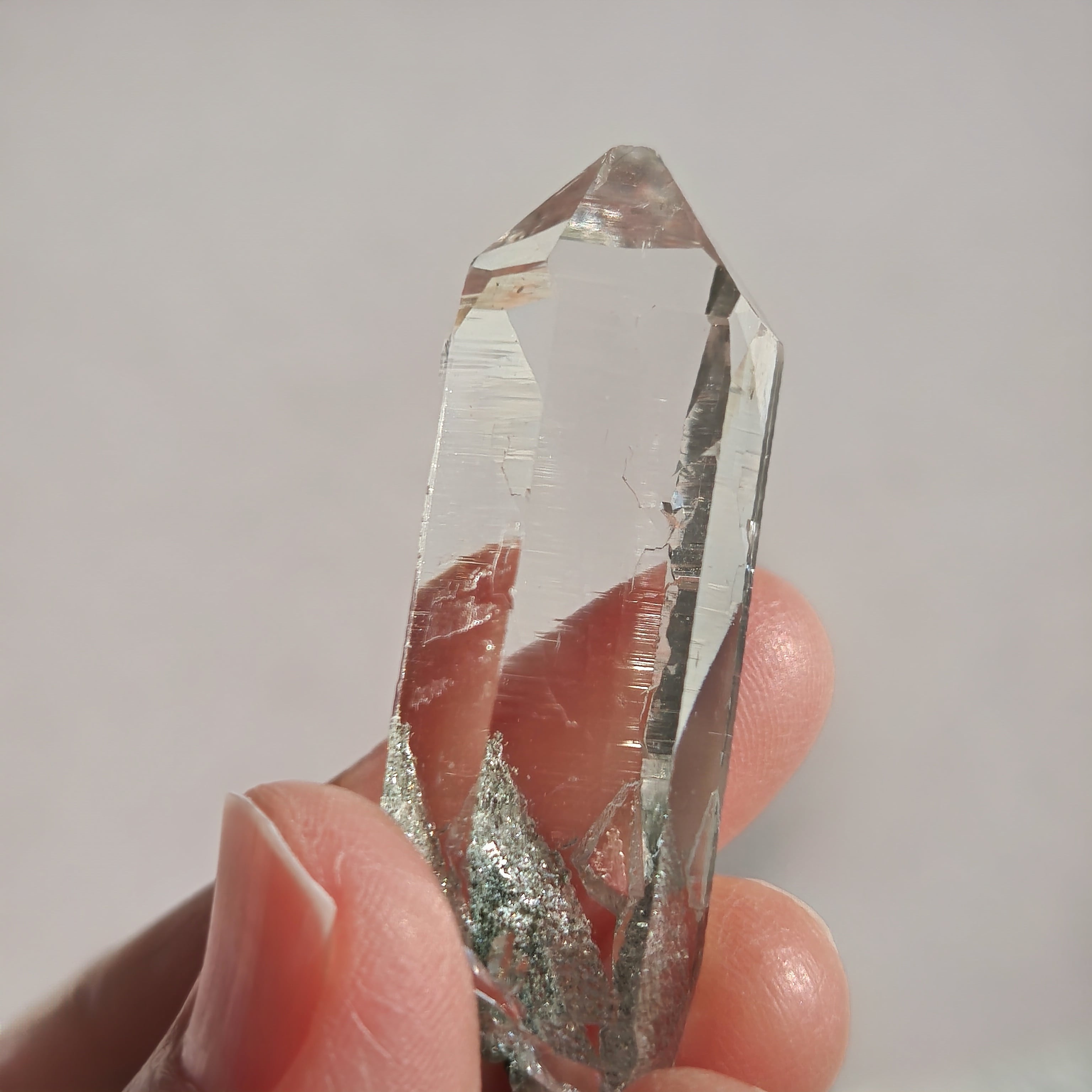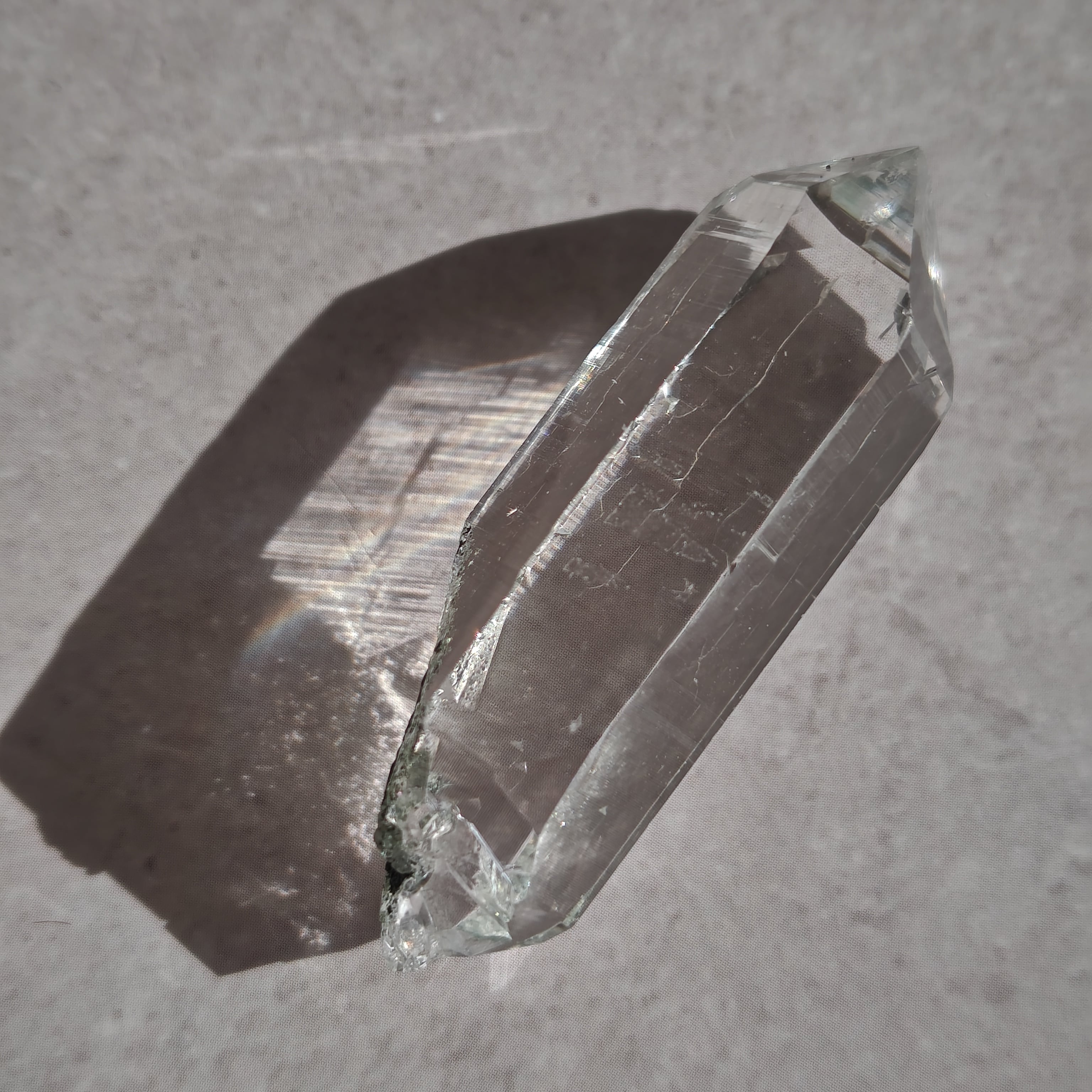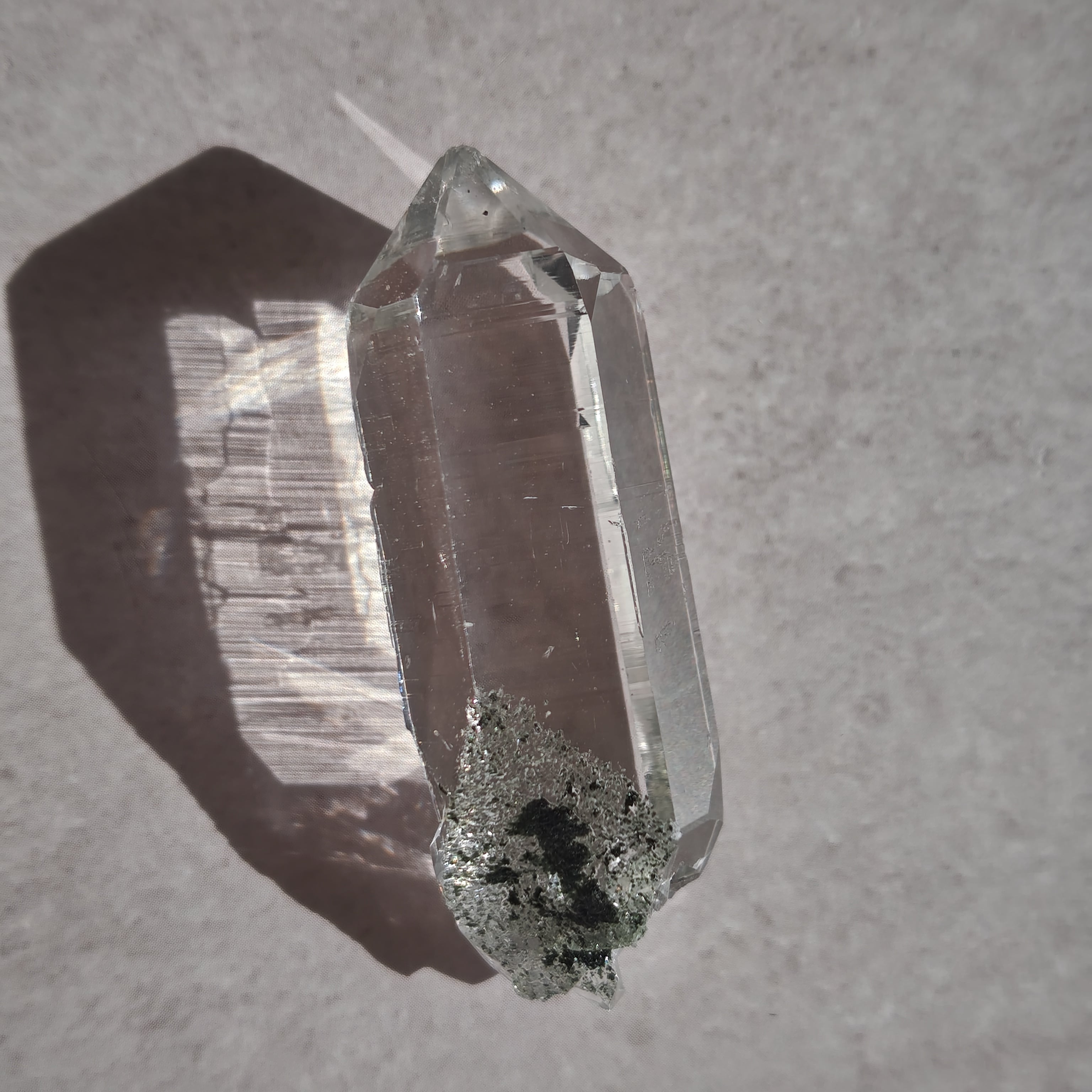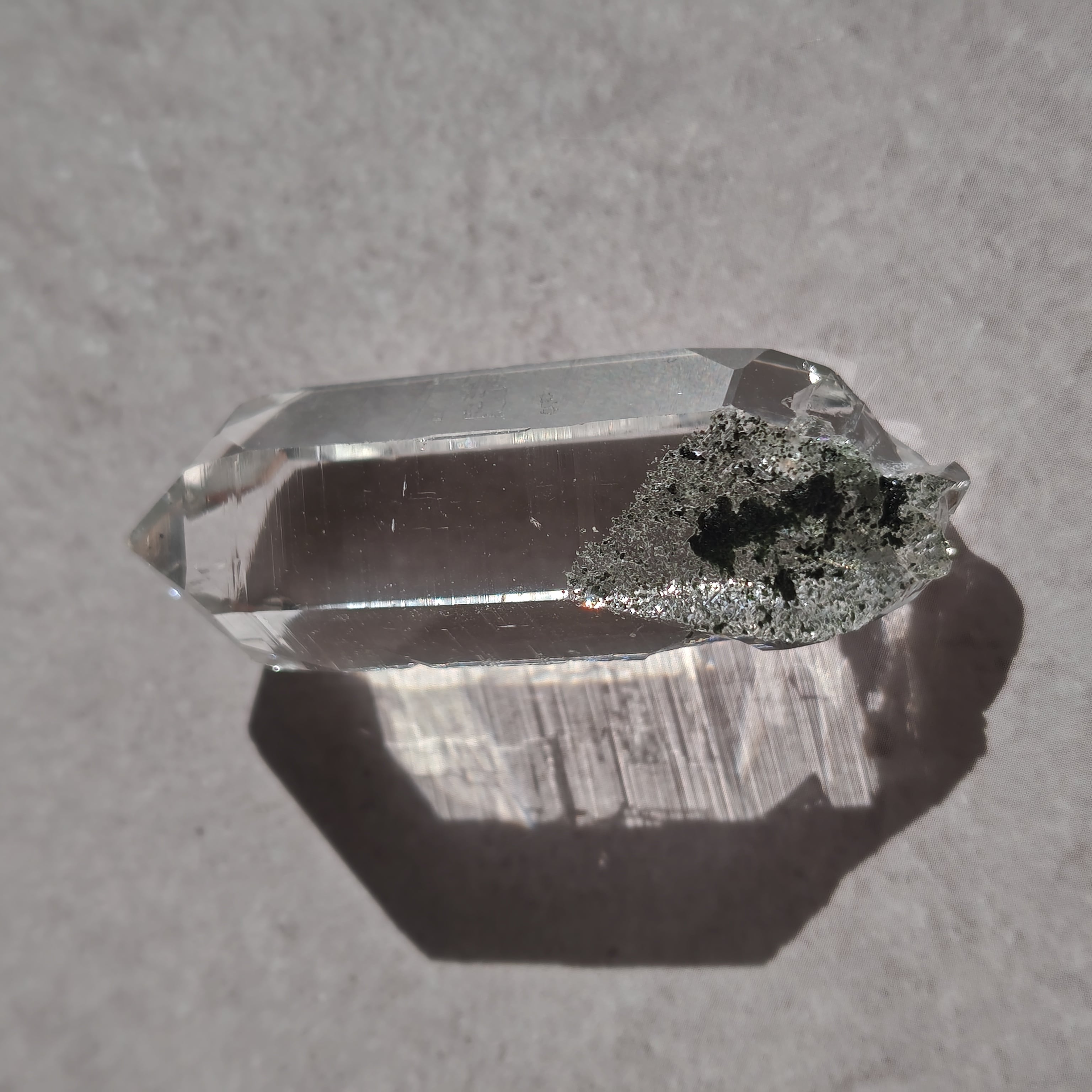 そっと背中を押す光を宿しています。この子は透明なだけではなく、根元に残る母岩の力強さにも惹かれました。