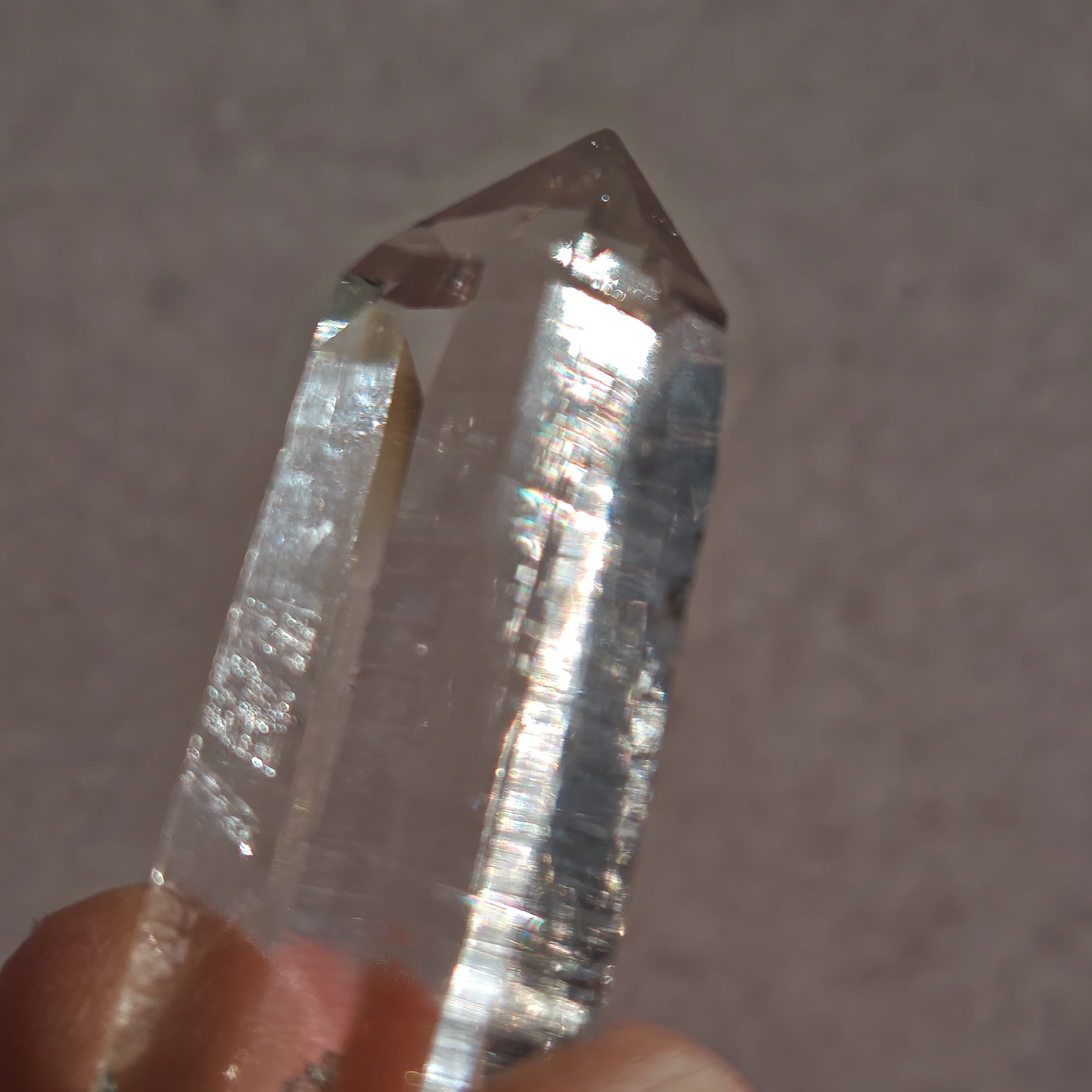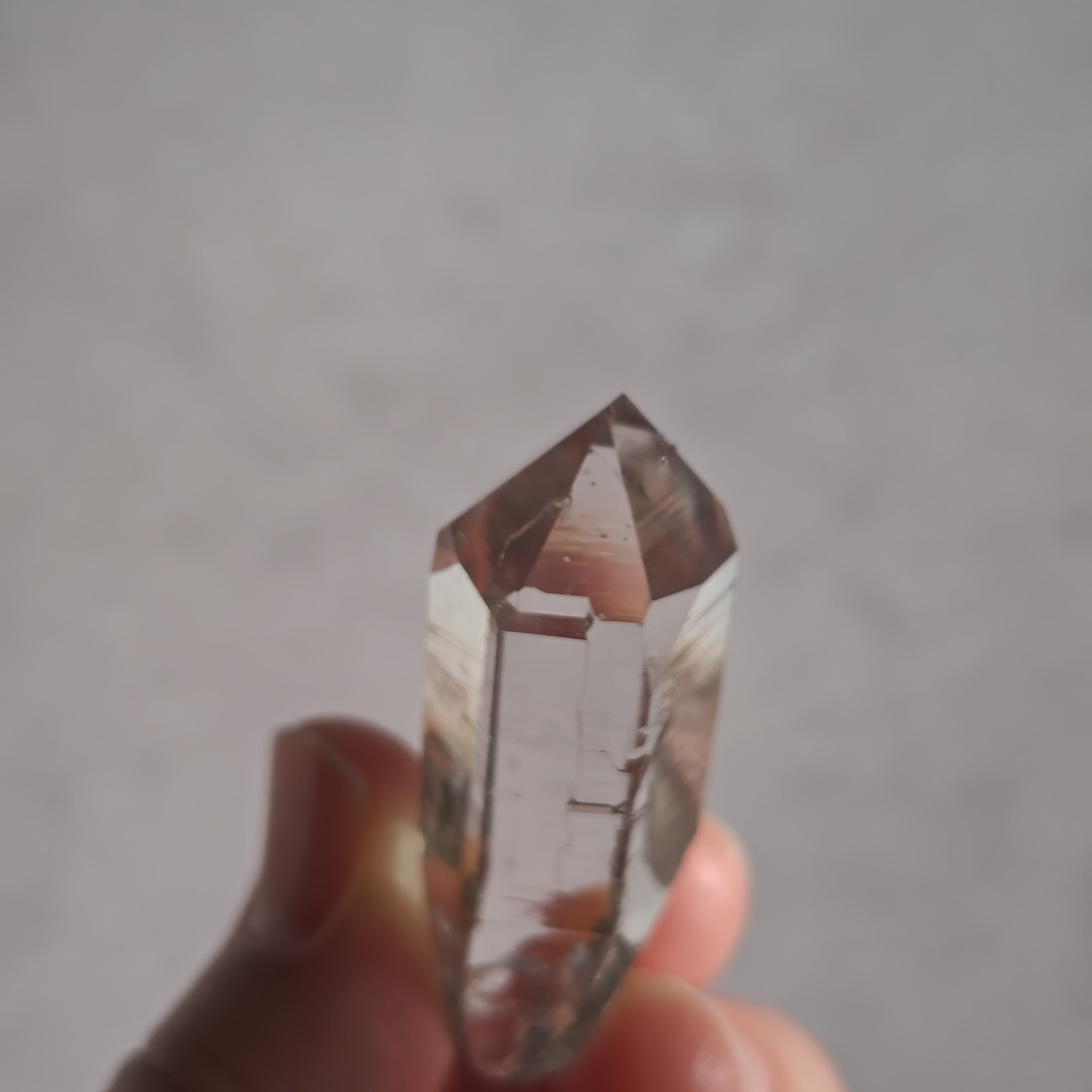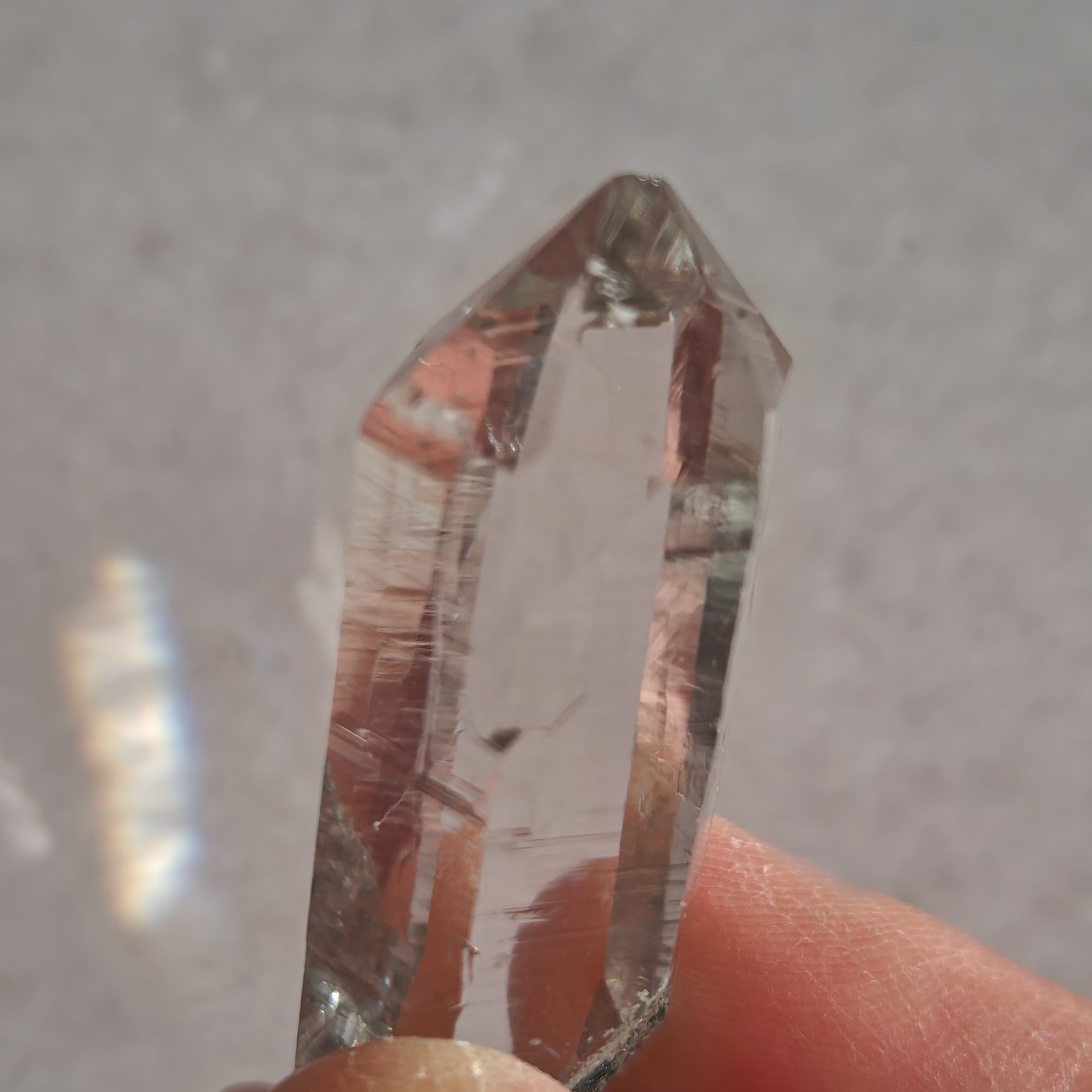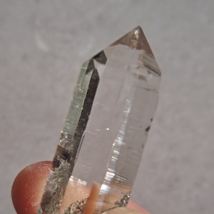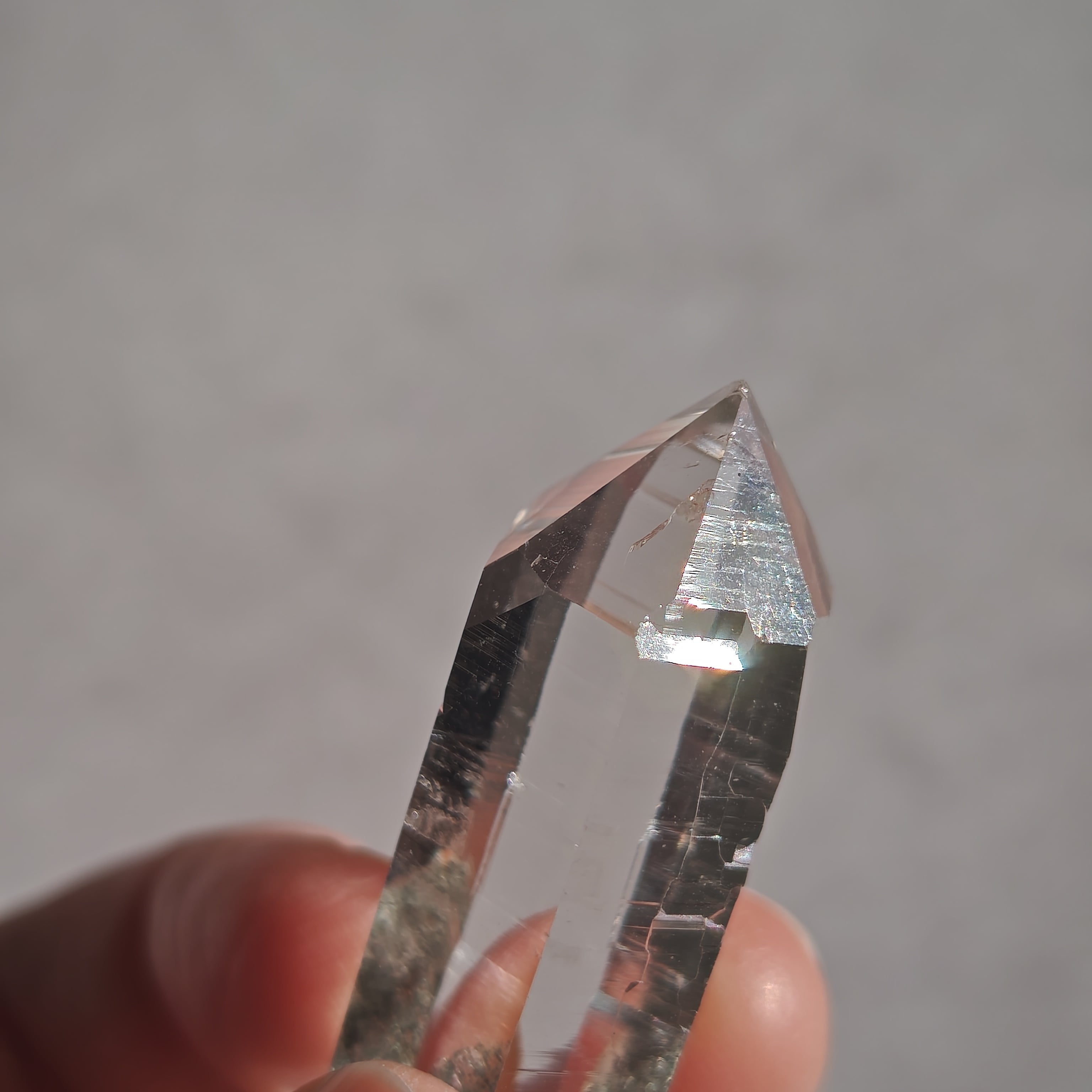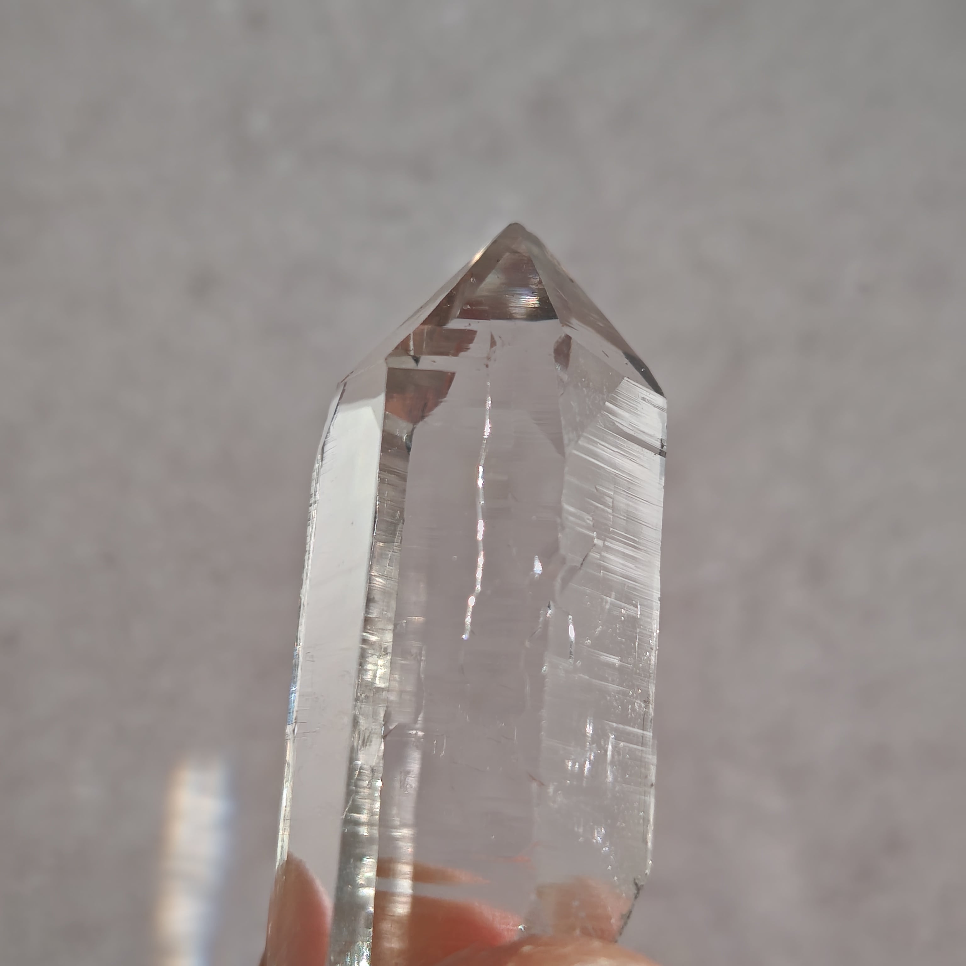 そっと背中を押す光を宿しています。この子は透明なだけではなく、根元に残る母岩の力強さにも惹かれました。