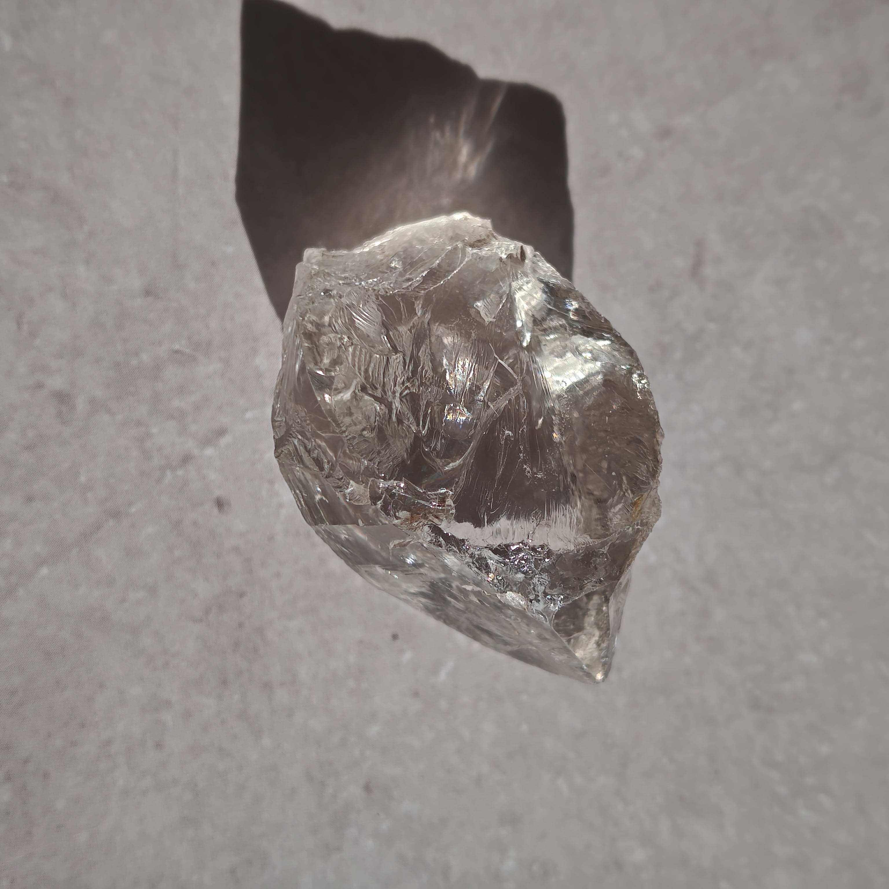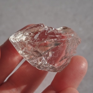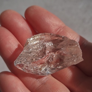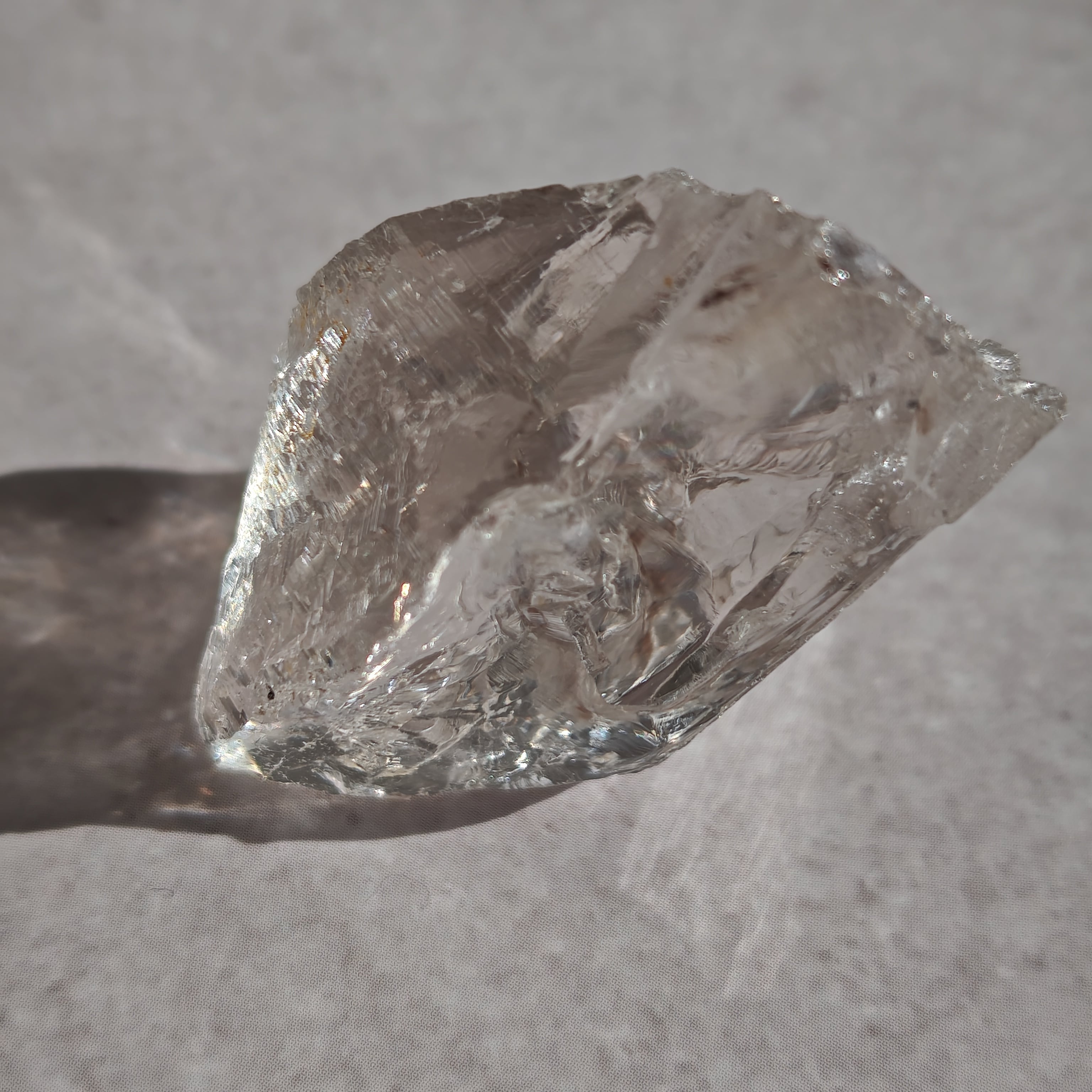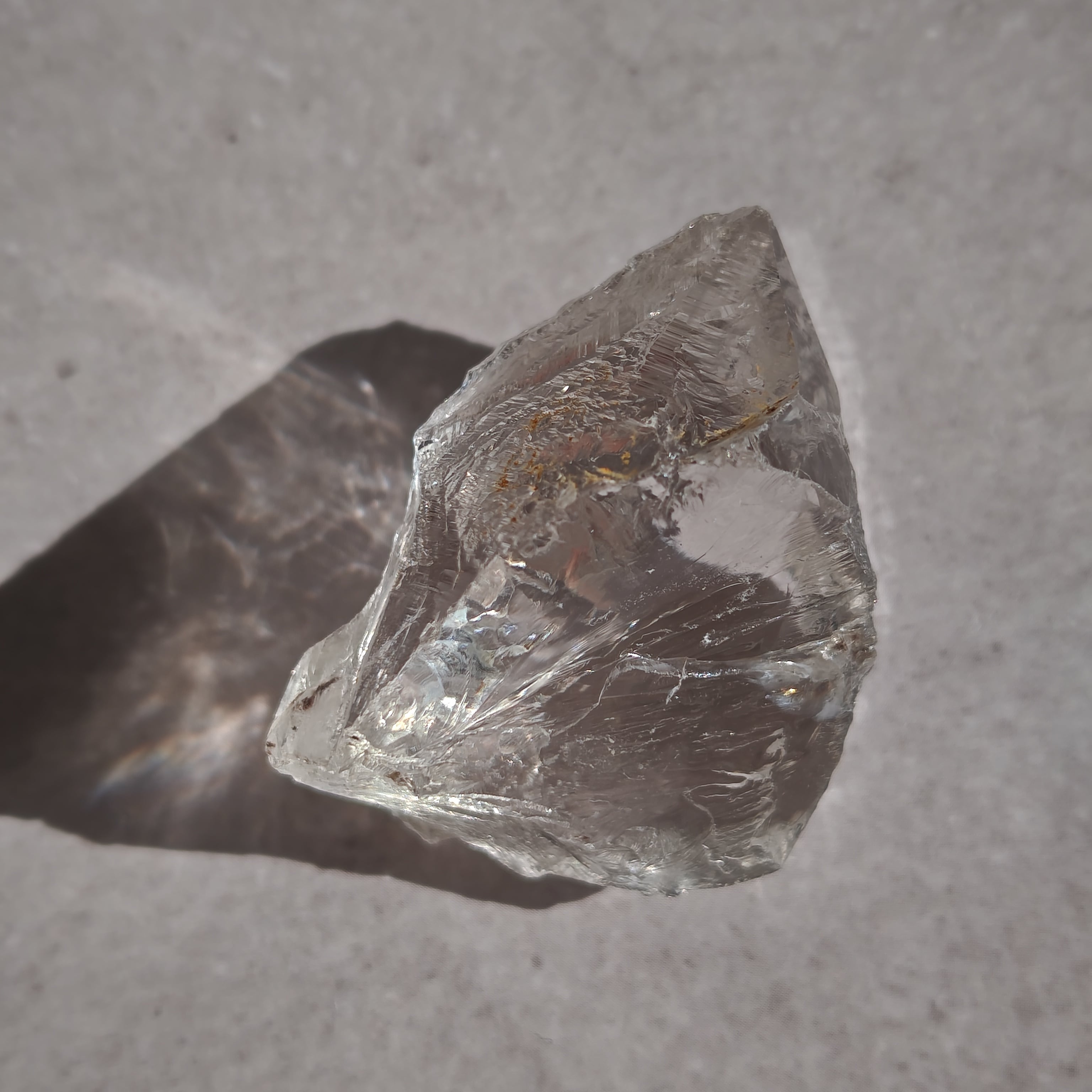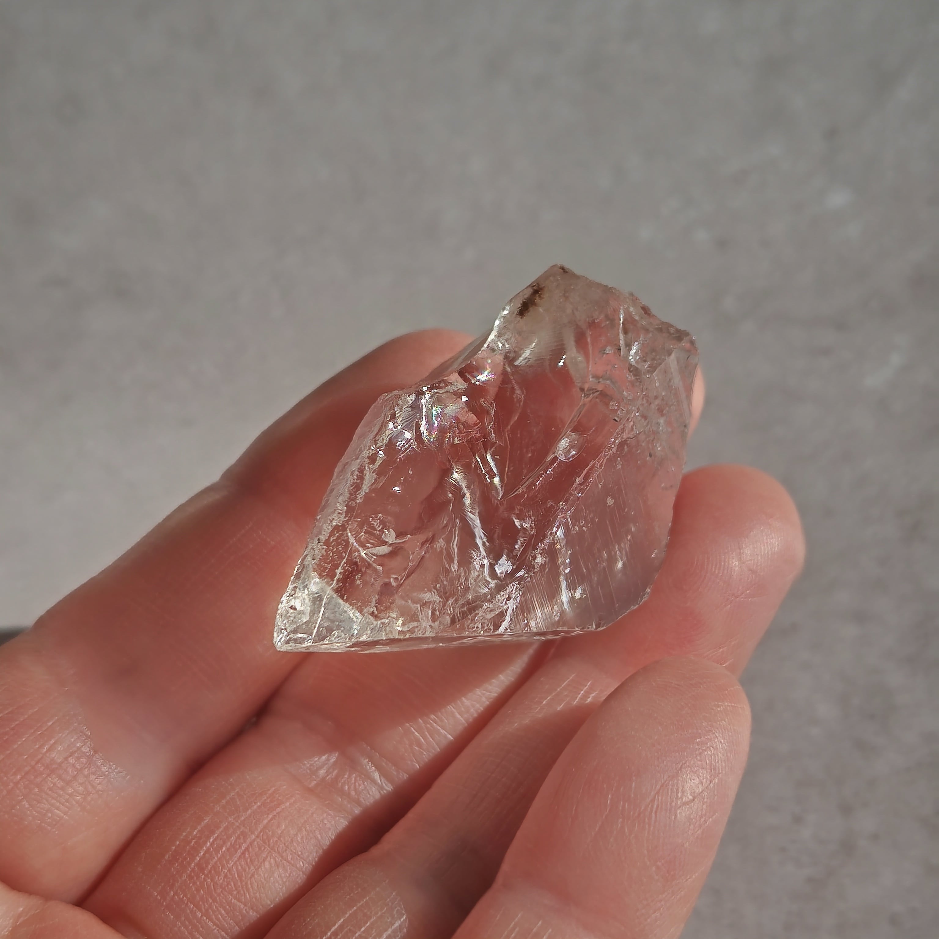 内部に繊細なクラックと光の筋を持ち、光を受けると柔らかな虹を宿します。