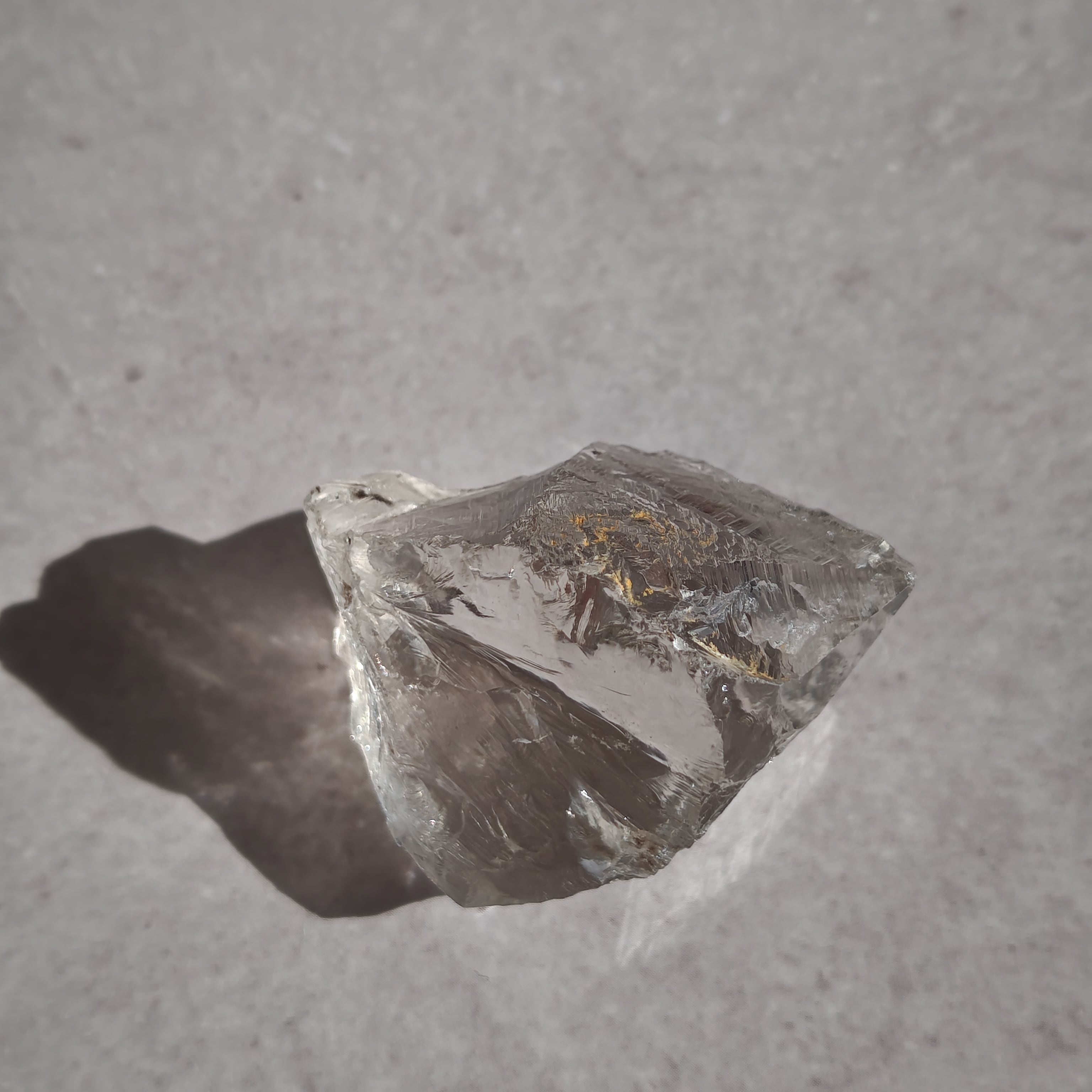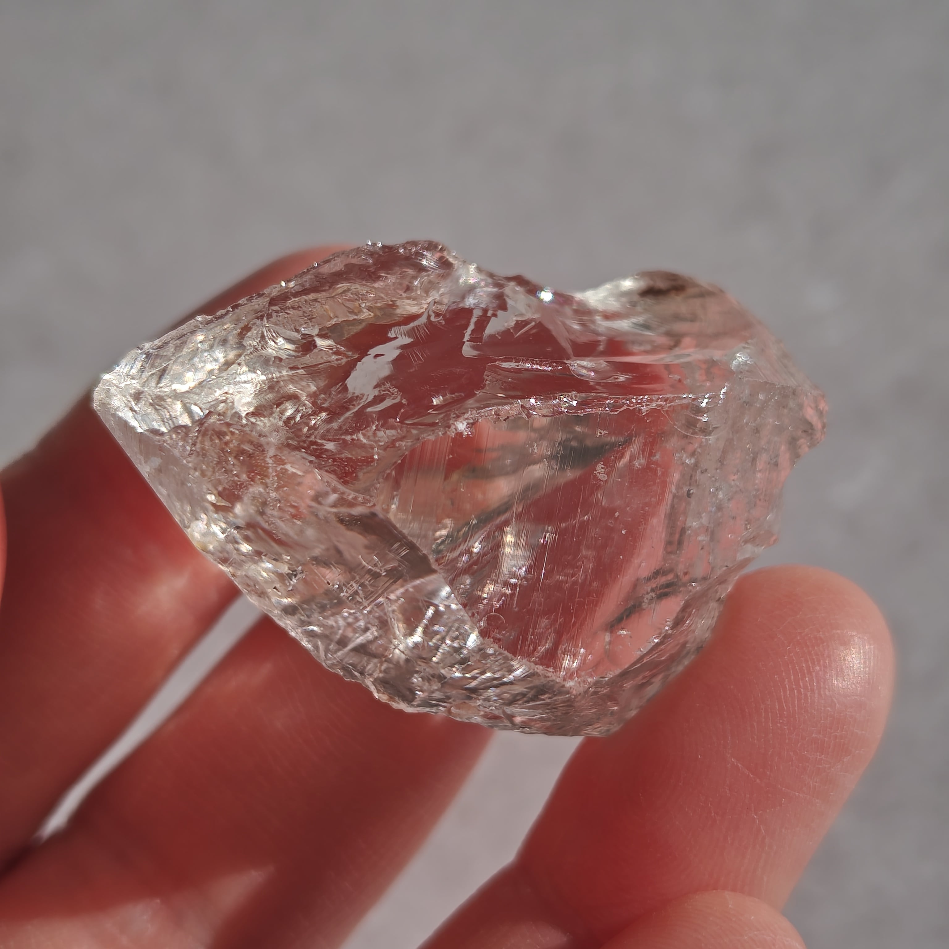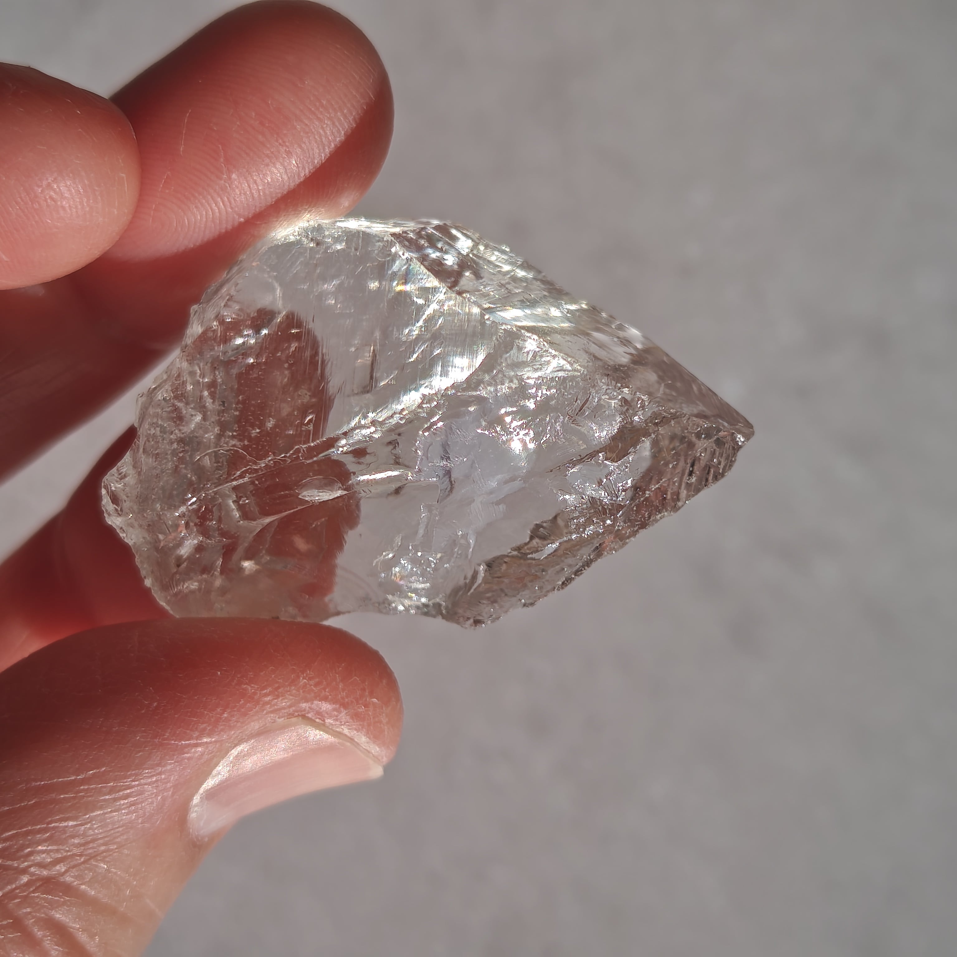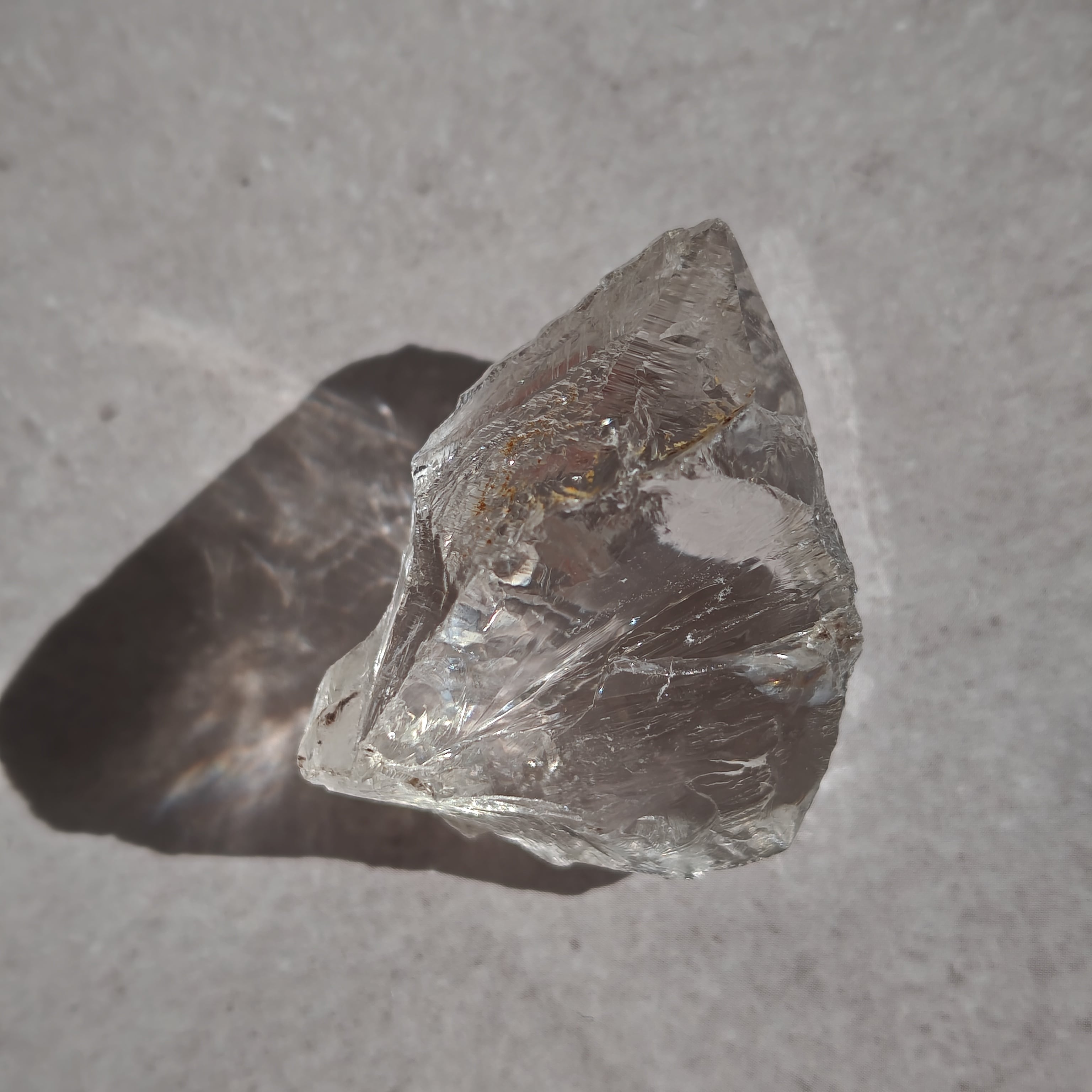 内部に繊細なクラックと光の筋を持ち、光を受けると柔らかな虹を宿します。