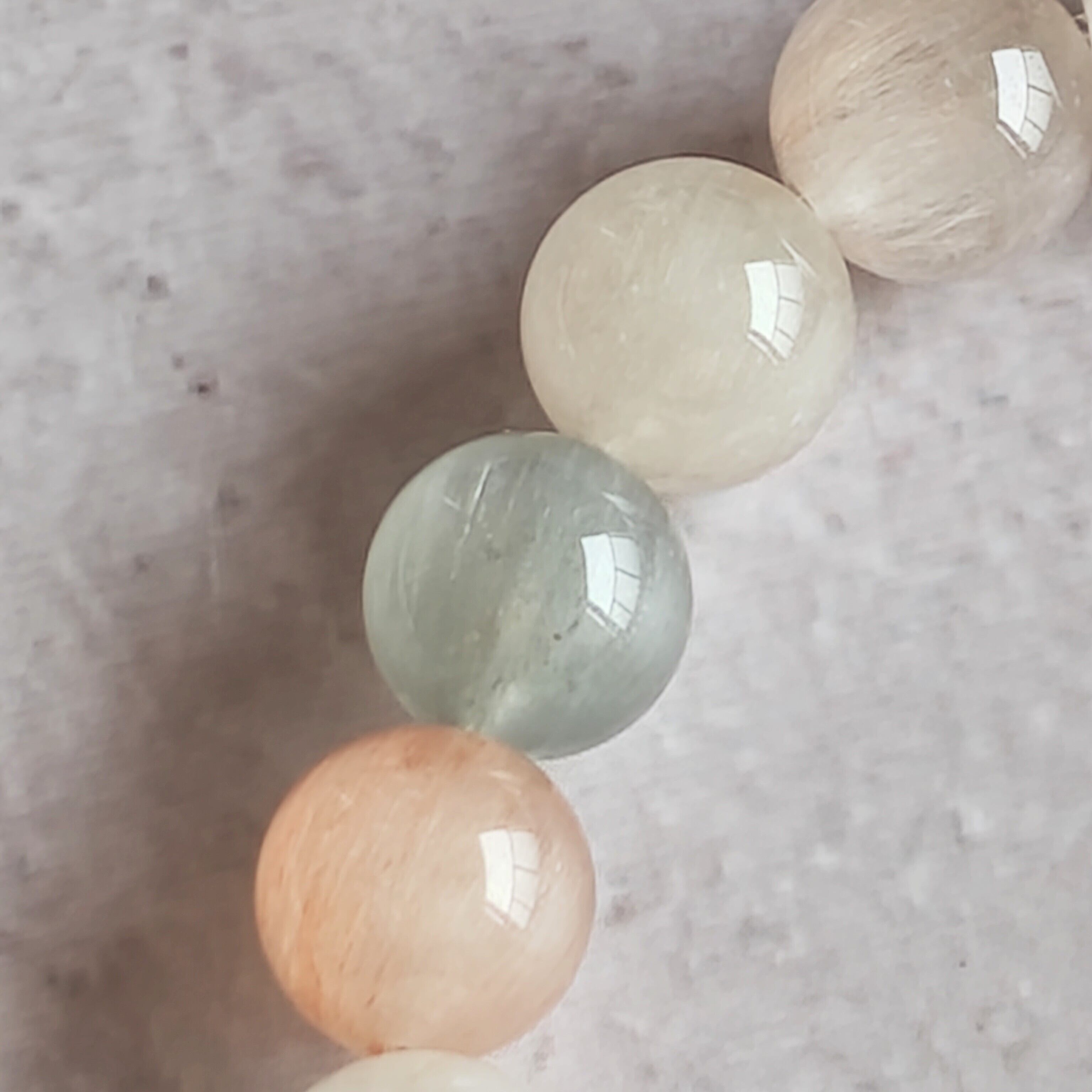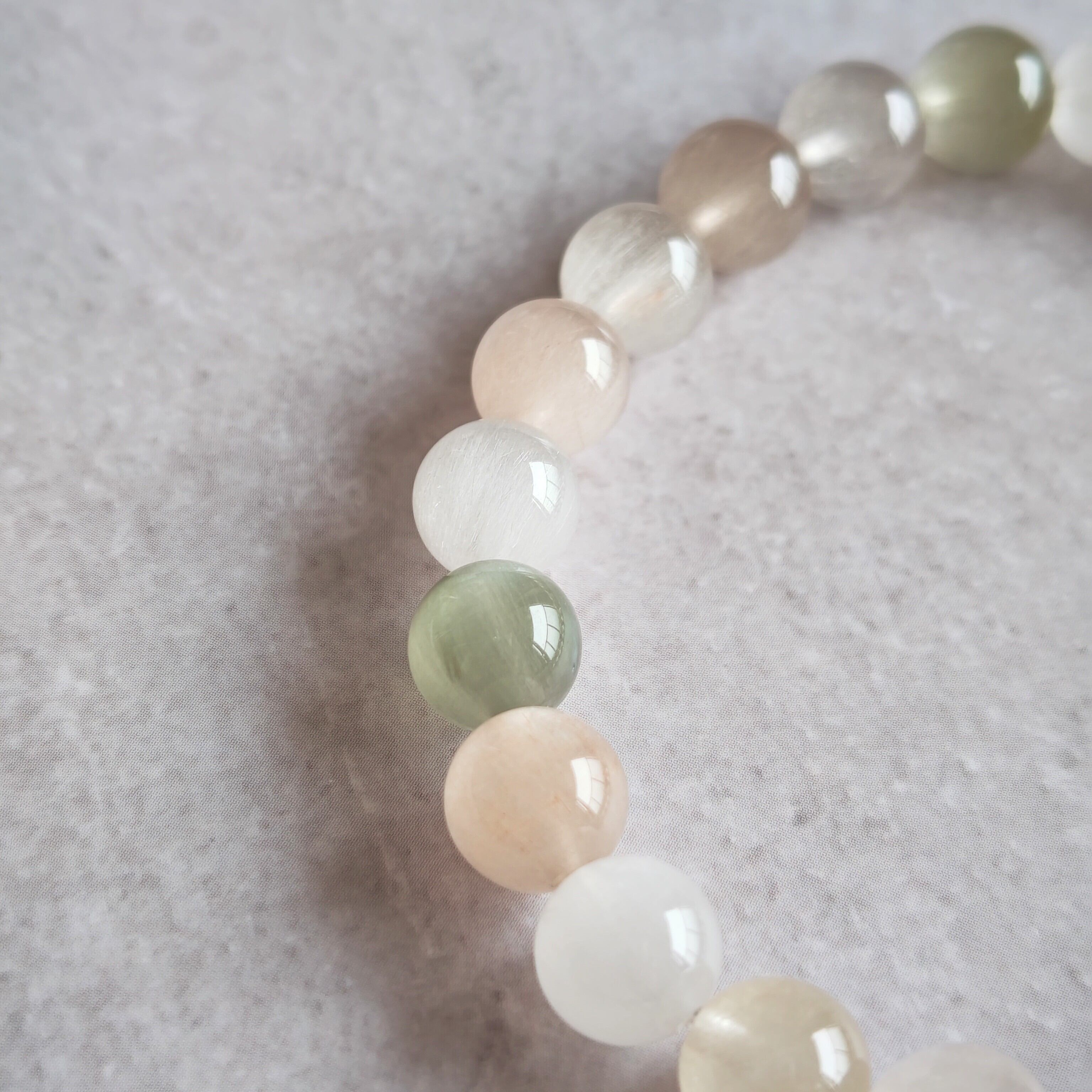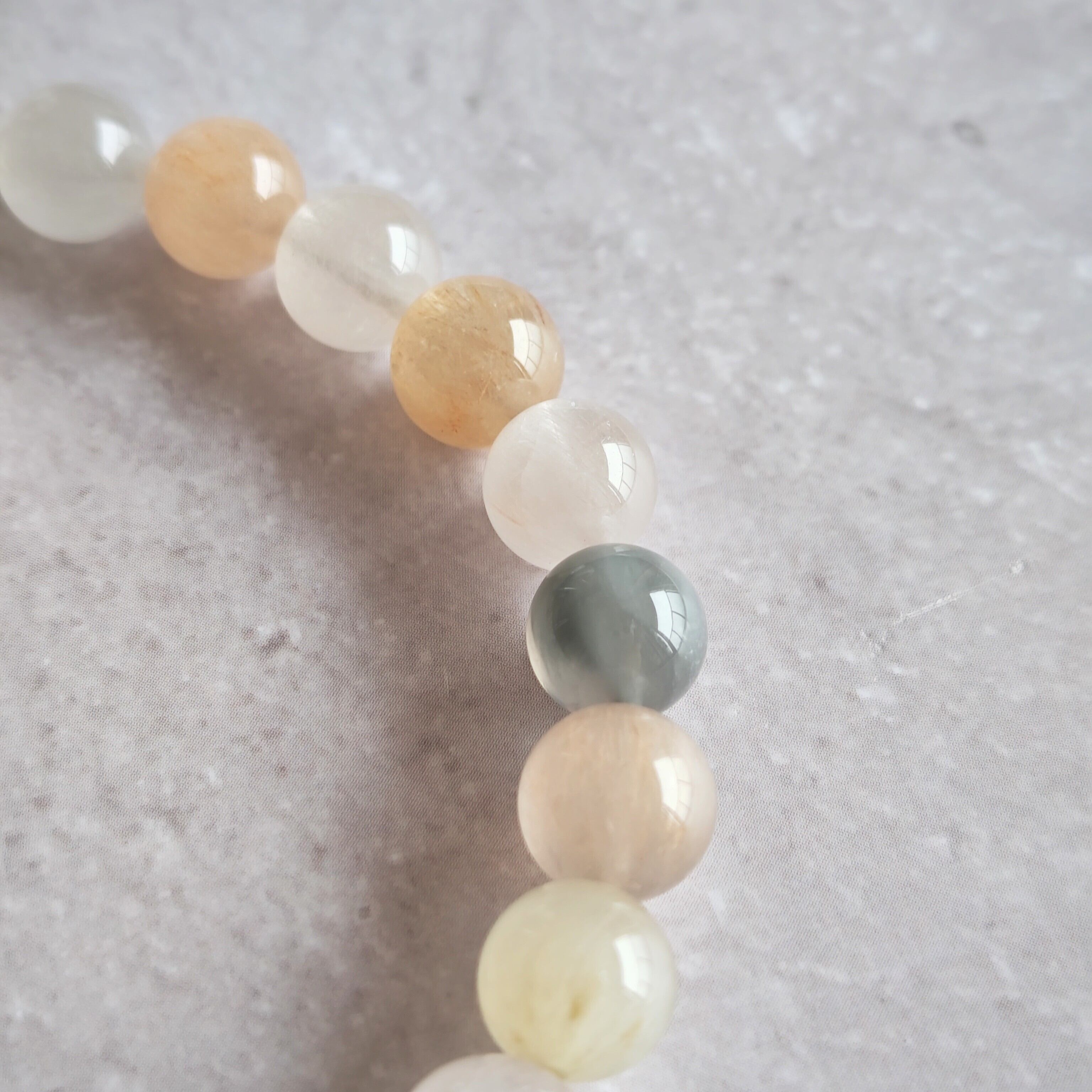 サゲニティッククォーツは、ピンクやホワイトやブルーが綺麗だなと思いますが、こちらのブレスレットは少し落ち着いたお色味でオトナのサゲさんですね!